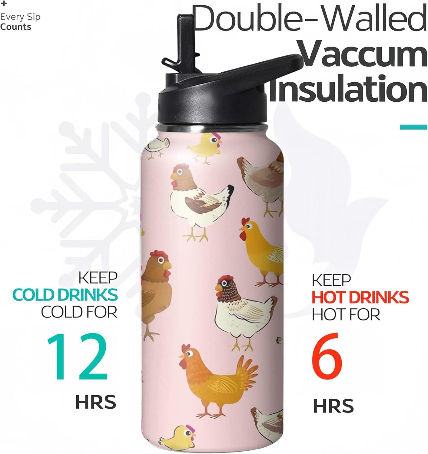 32oz Cute Chicken Water Bottle with Handle and Flip Straw, Sports Stainless Steel Insulated Cup, Travel Coffee Mug Tumbler, Birthday Mothers Day Chritmas Gifts for Women Animal Lovers