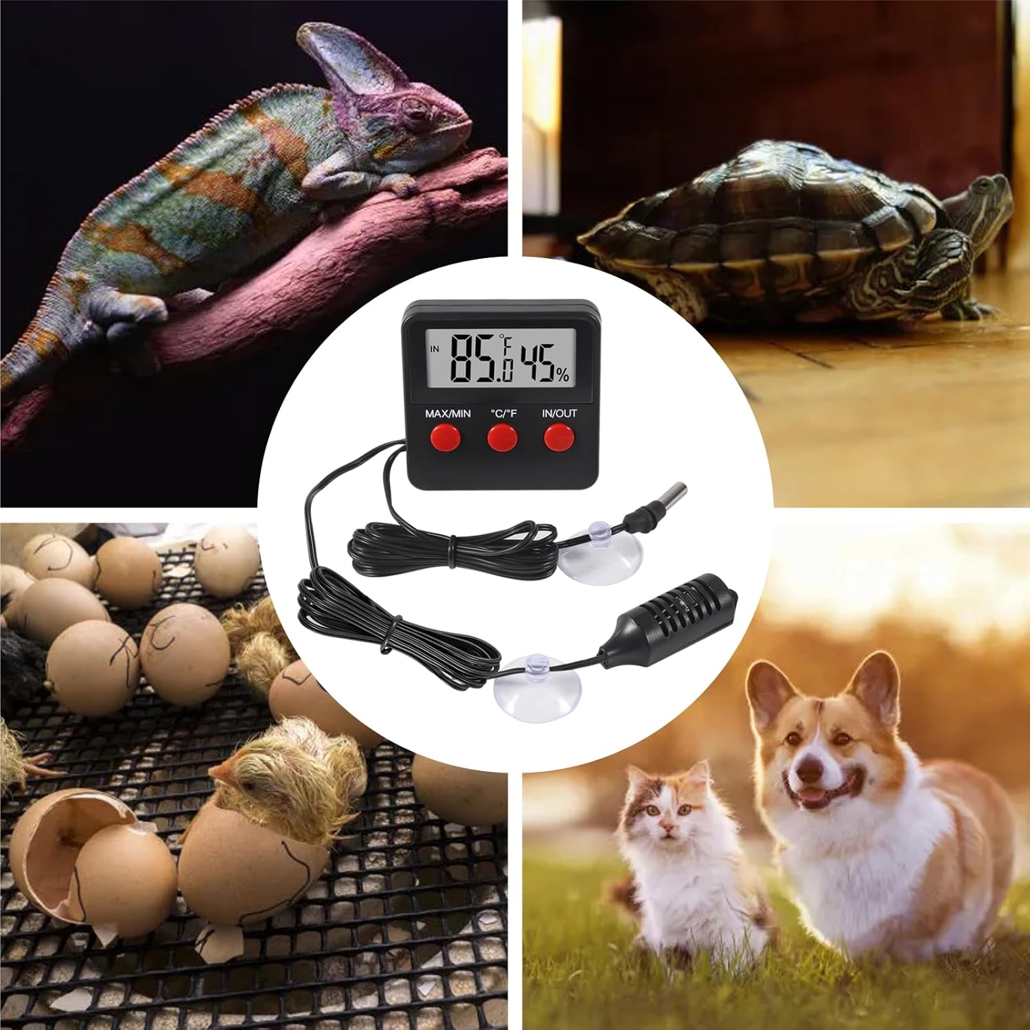 【Wide Application】 Reptile thermometer hygrometer is suitable for aquariums, fish tanks, reptile boxes, incubators, refrigerators, cigar houses, etc. It can protect reptiles, fish and small animals from dangerous temperatures.