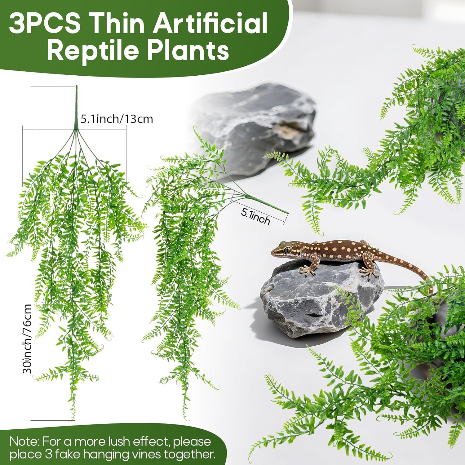 3PCS Reptile Plants for Terrarium – Fake Hanging Terrarium Plants, Artificial Boston Fern for Bearded Dragon Snake Geckos Hermit Crab Lizard Chameleon Turtle Reptile Decor(L30 xW5.1)