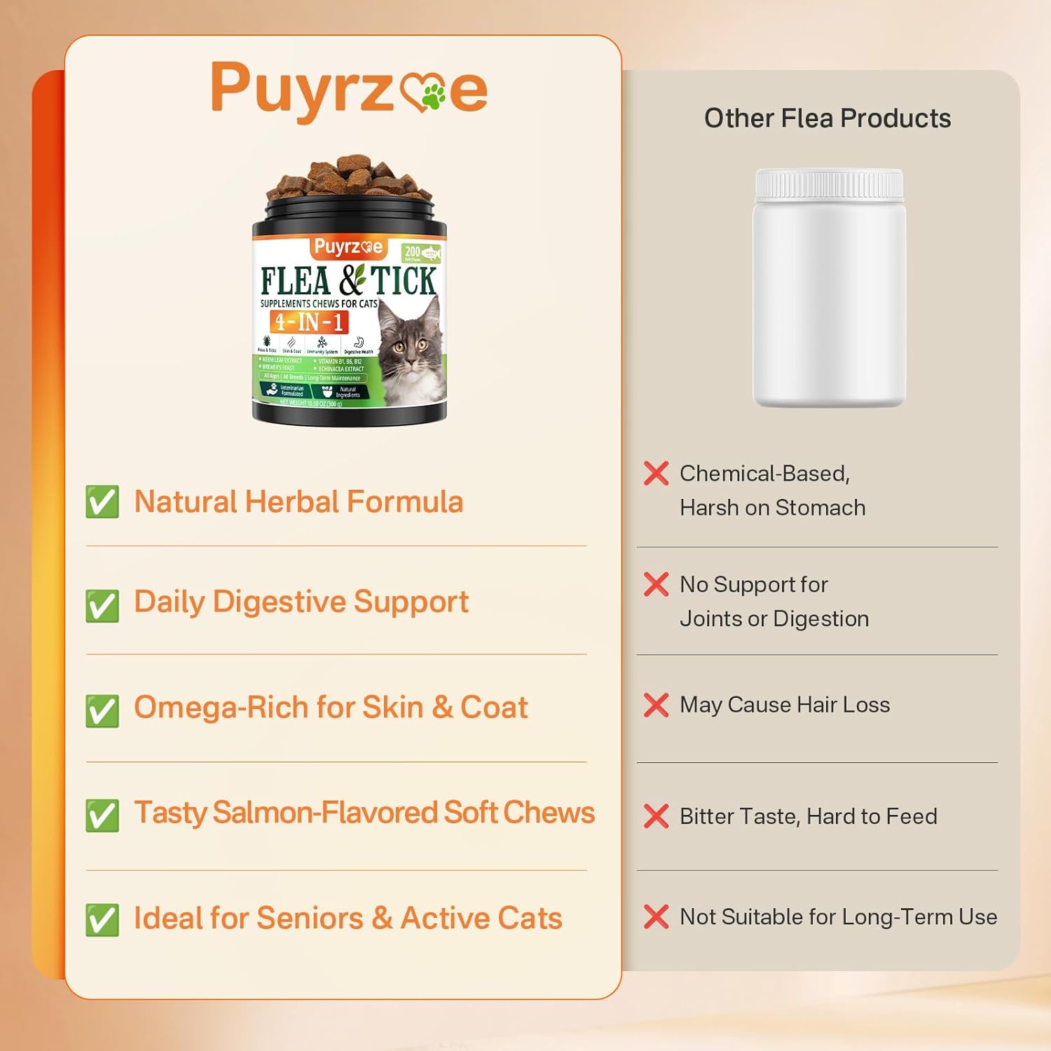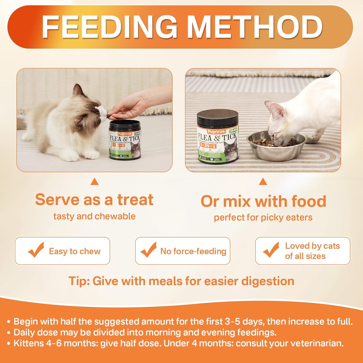 Natural 4-in-1 Flea & Tick Defense: Puyrzoe Natural 4-in-1 flea treatment for cats chewables feature unique and natural ingredients, including Neem, Brewer’s Yeast, Echinacea Extract, and VITAMIN B1, B6, B12. This daily supplement not only helps support a natural balance approach to flea and tick care, but also supports skin & coat health and immune health. Especially suitable for active outdoor cats and seniors, helping them soothe itching and enjoy natural protection.