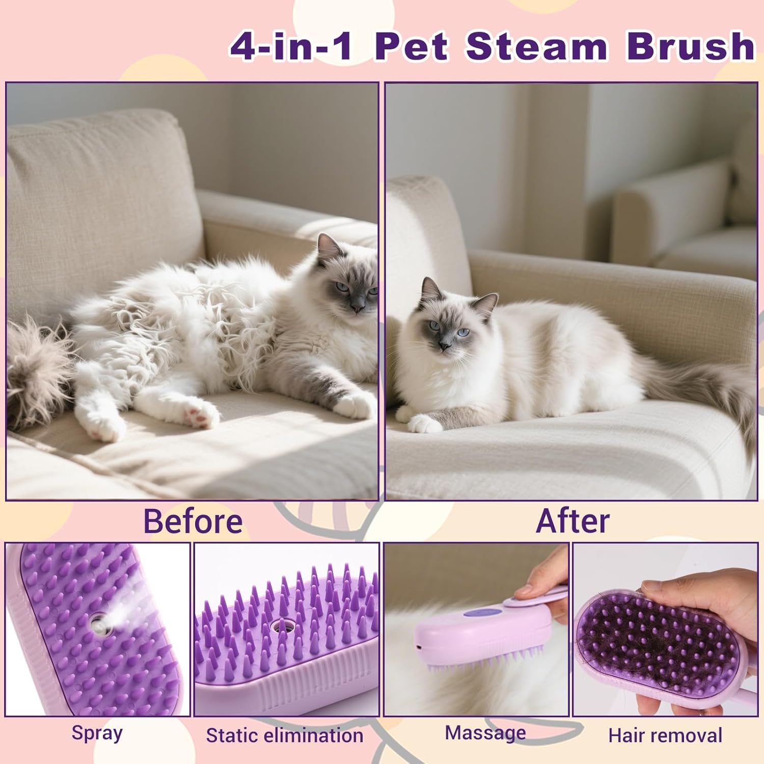 4-in-1 Pet Steam Brush for Dogs & Cats – Anti-Static Deshedding Grooming Tool with Massage & Cleaning for Long/Short Hair | Micro-B Rechargeable (Purple)