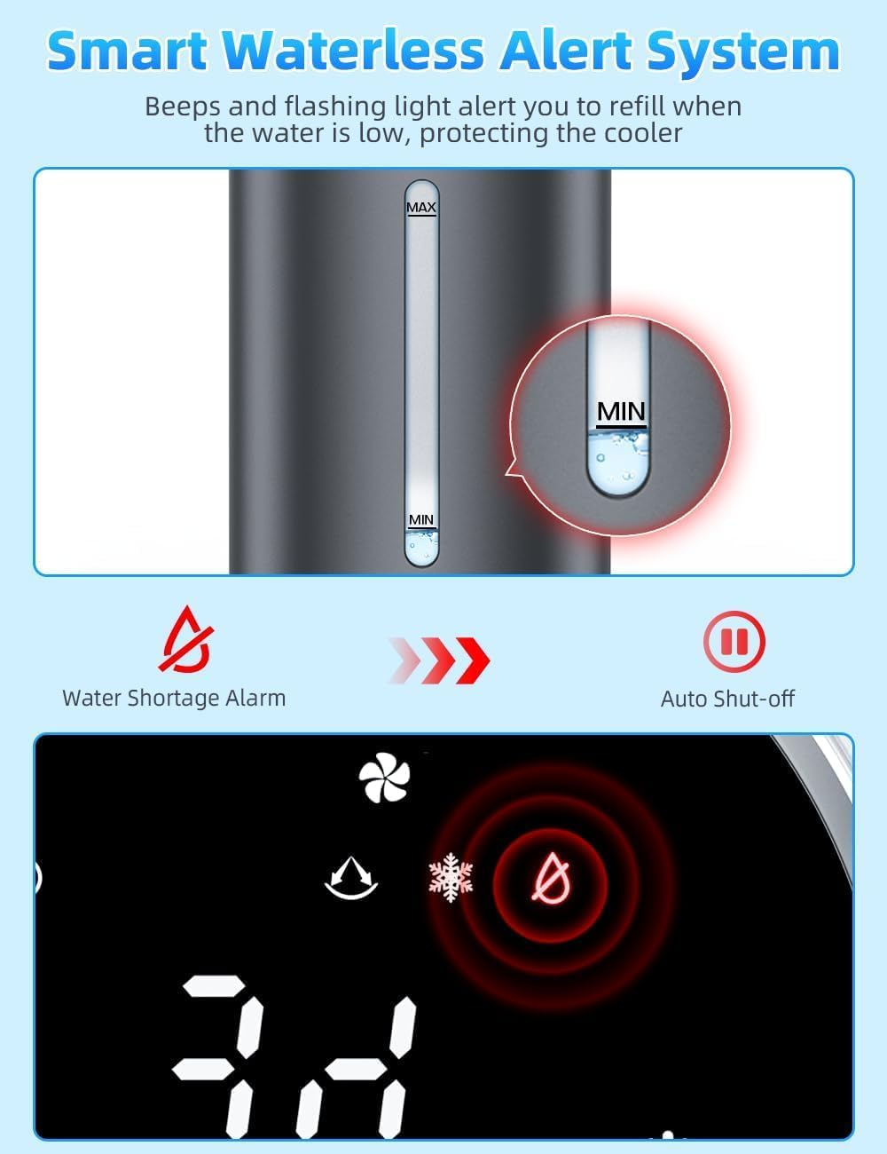 【𝐒𝐦𝐚𝐫𝐭 𝐋𝐄𝐃 𝐓𝐨𝐮𝐜𝐡 𝐃𝐢𝐬𝐩𝐥𝐚𝐲 & 𝐑𝐞𝐦𝐨𝐭𝐞 𝐂𝐨𝐧𝐭𝐫𝐨𝐥】Choose between 2 control options: the LED touch control or the remote control, our evaporative cooler is designed for ultimate convenience. The intuitive LED display allows for easy adjustments and real-time monitoring. Enjoy convenient remote operation up to 20 ft, ensuring effortless comfort. Whether you’re relaxing or preparing for bed, the remote control puts climate comfort right at your fingertips.
