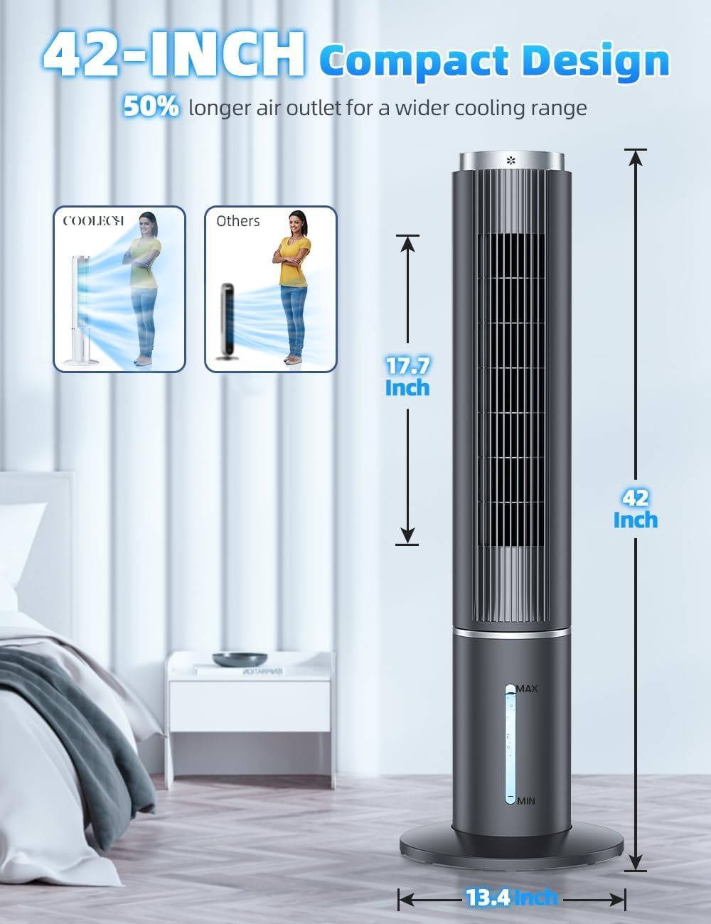 【𝟗𝟎° 𝐎𝐬𝐜𝐢𝐥𝐥𝐚𝐭𝐢𝐨𝐧 𝐂𝐨𝐯𝐞𝐫𝐬 𝐮𝐩 𝐭𝐨 𝟑𝟎𝟎 𝐬𝐪. 𝐟𝐭】Boasting 17.7-inch air outlets and a 90° auto-oscillation range, this 42-inch swamp cooler air conditioner delivers even cooling airflow to the room. with a powerful airflow of up to 1400 CFM and 28ft air throw distance, COOLECH portable swamp cooler can quickly cool room areas up to 300 sq. ft, allowing you to enjoy a cooling breeze even from a considerable distance.