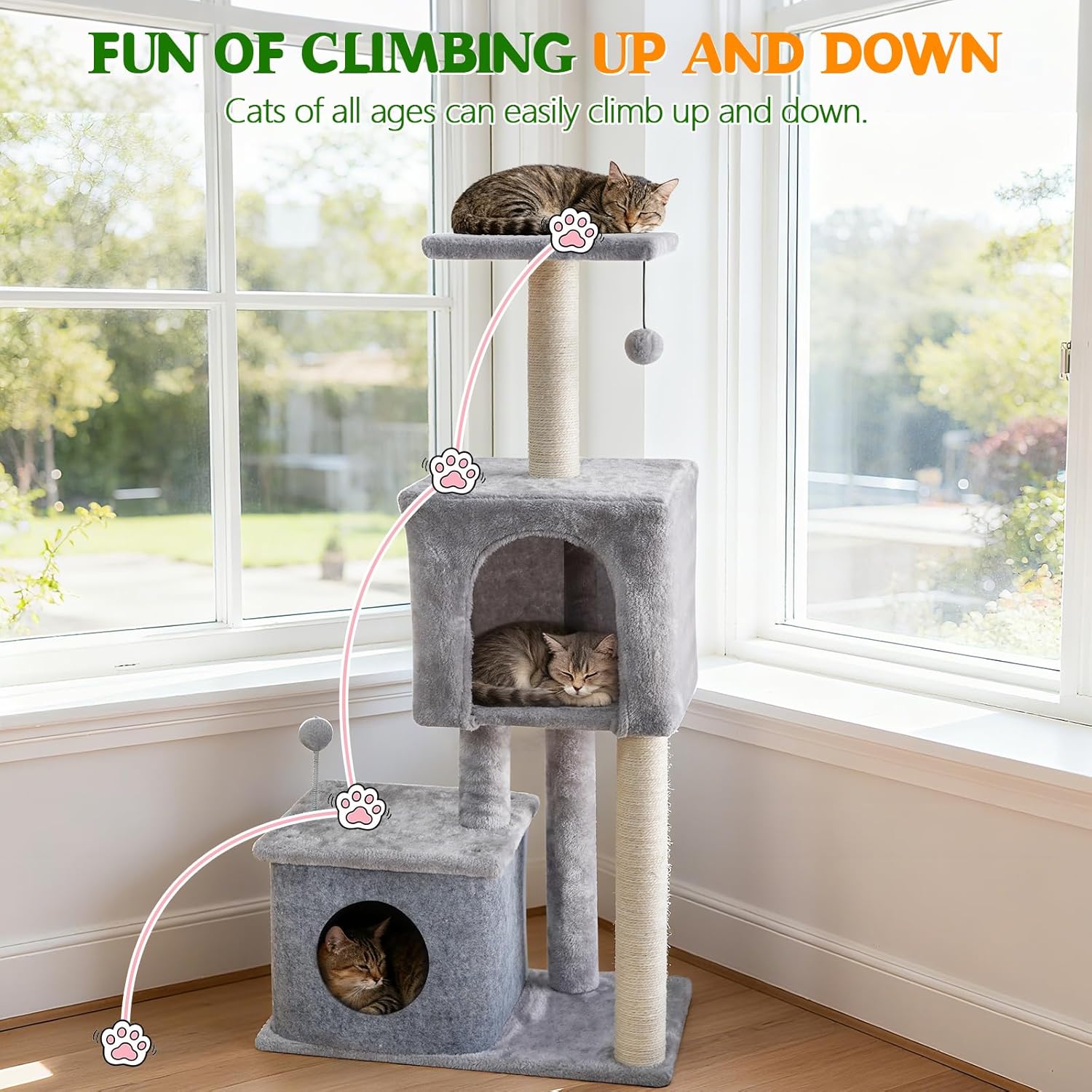 Finally a cat tree that stops my kitties from scratching the couch! The sisal-wrapped posts are perfect for their claw-sharpening needs. The little balls are a hit tooâmy kitten bats them around nonstop. Setup was easy, and it feels solid. So glad I bought this!
