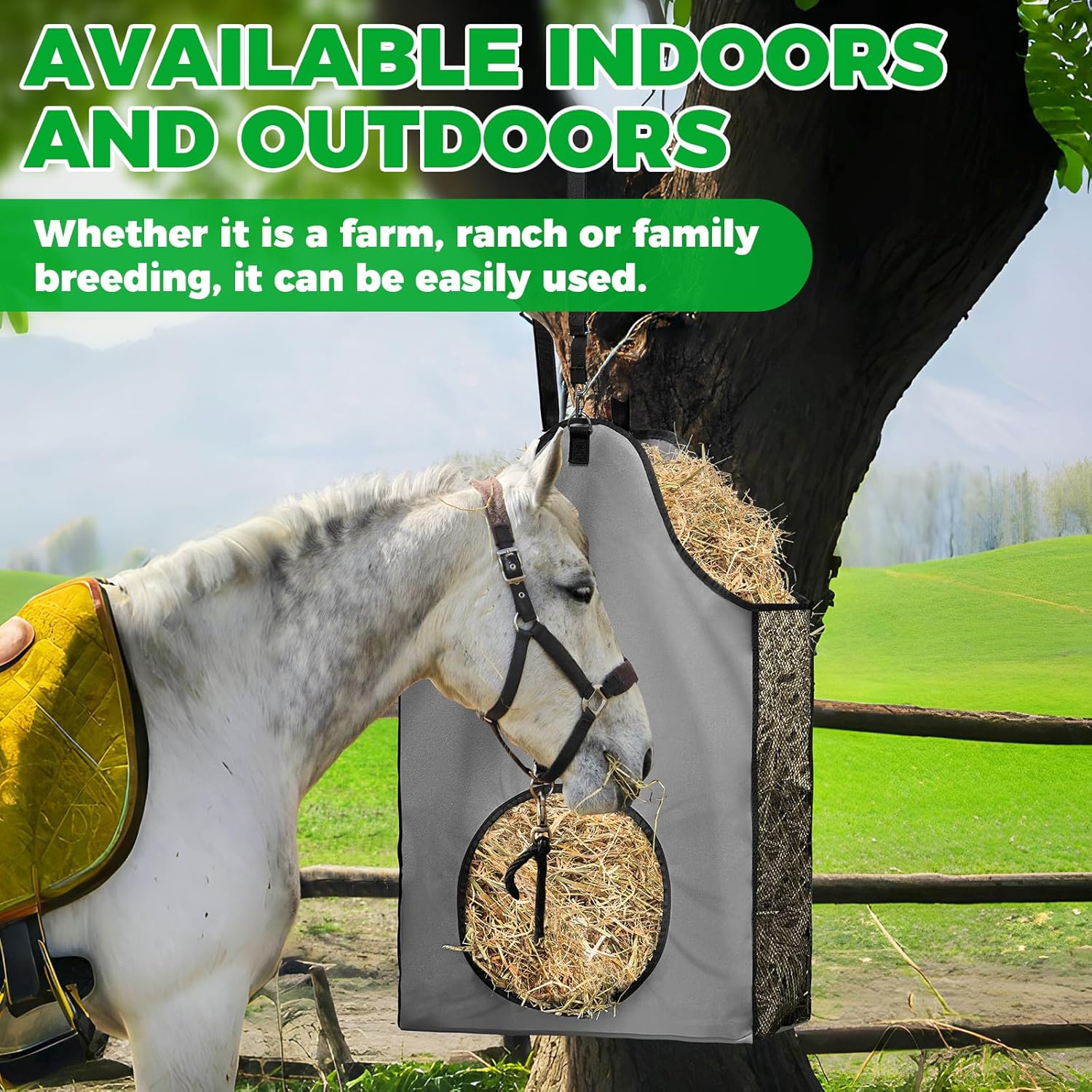 【600D Oxford Cloth】This hay bag is made of high-quality 600D Oxford cloth, which is extremely wear-resistant and durable. It is not only waterproof and moisture-proof, but also effectively prevents the hay from getting damp and deteriorating, ensuring the freshness and nutrients of the feed are not lost. It is durable even when used outdoors.