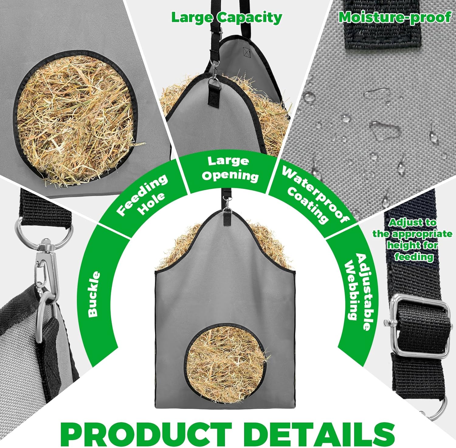 5 reviews for 4PCS Hay Bag Goat Hay Feeder Slow Feed Hay Bags 600D Oxford Cloth with Metal Ring and Adjustable Strap Hay Bags for Horses Goats Sheep Donkeys Cows (2 Black+2 Grey