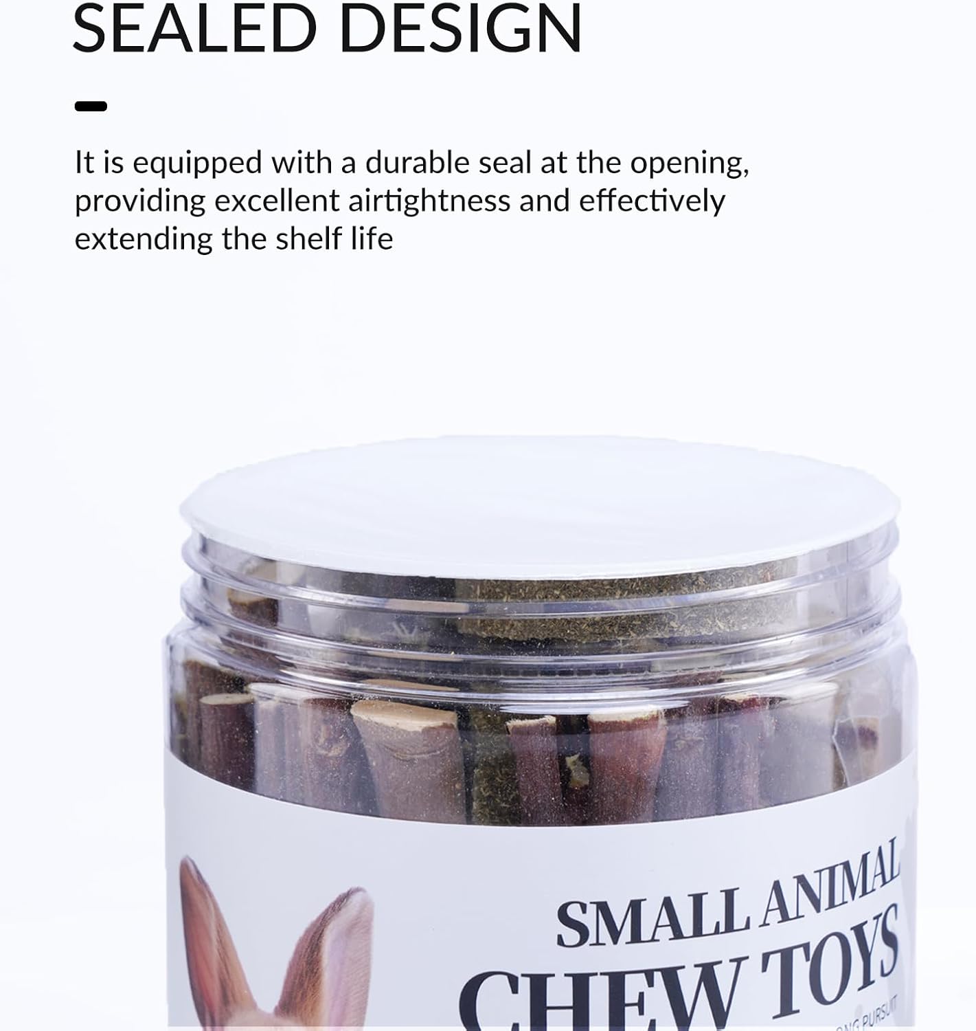 【Sealed Design for Rabbit Chew Toys for Teeth】The jar containing this rabbit chew toys is equipped with a durable seal at the opening, providing excellent airtightness and effectively extending the shelf life of the toys. The jar and lid are precisely threaded to ensure a tight seal when the lid is screwed on, preventing air and moisture from entering even when the toys are not in use. This also helps to extend the shelf life of the guinea pig chew toys for teeth.