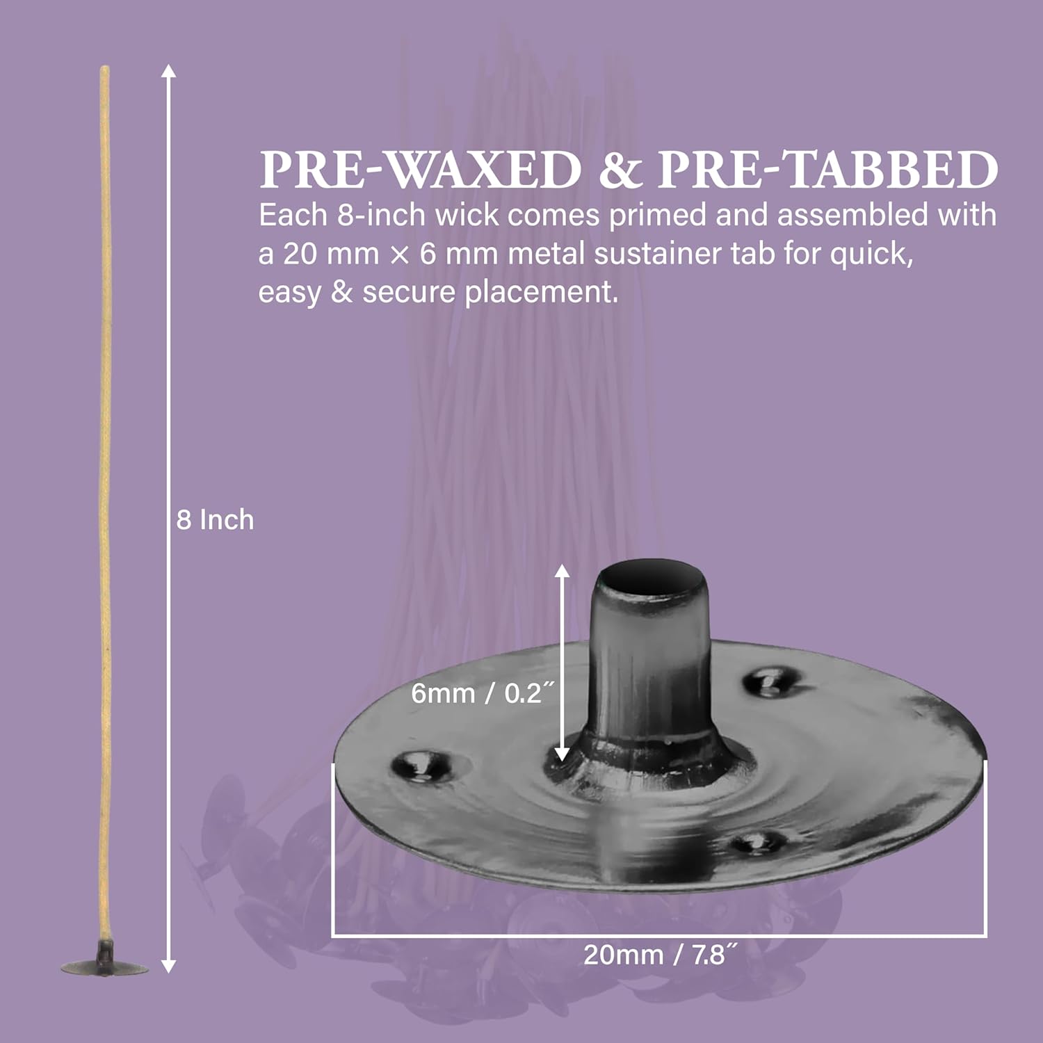 | 50 Pack | Zinc Core Candle Wicks (51-32-18) | 8 Inch | Pre-Waxed & Pre-Tabbed with Metal Sustainer Tabs | DIY Candle Making Supplies | Best Wicks for Gel & Paraffin Container Candles