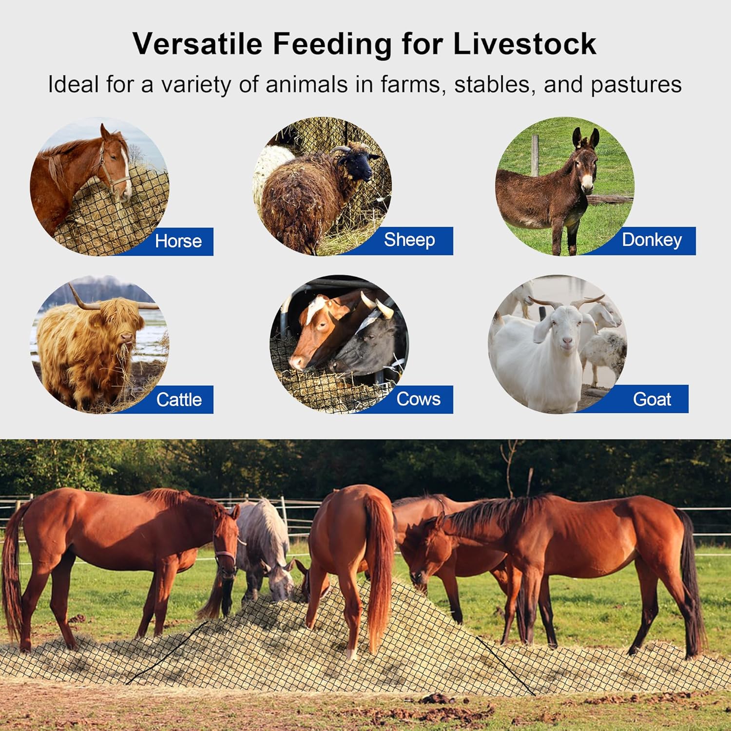 【Portable & Versatile】This horse hay bag set includes a 5’x5′ hay net, a repair shuttle, 20 black self-locking ties, and 66FT repair twine, all designed for lightweight and easy handling. Compatible with a wide range of livestock, including horses, cattle, sheep, and goats, it supports efficient feeding while meeting diverse needs. Perfect for use in stables or outdoors, this set provides a practical solution for streamlined feeding and livestock care.
