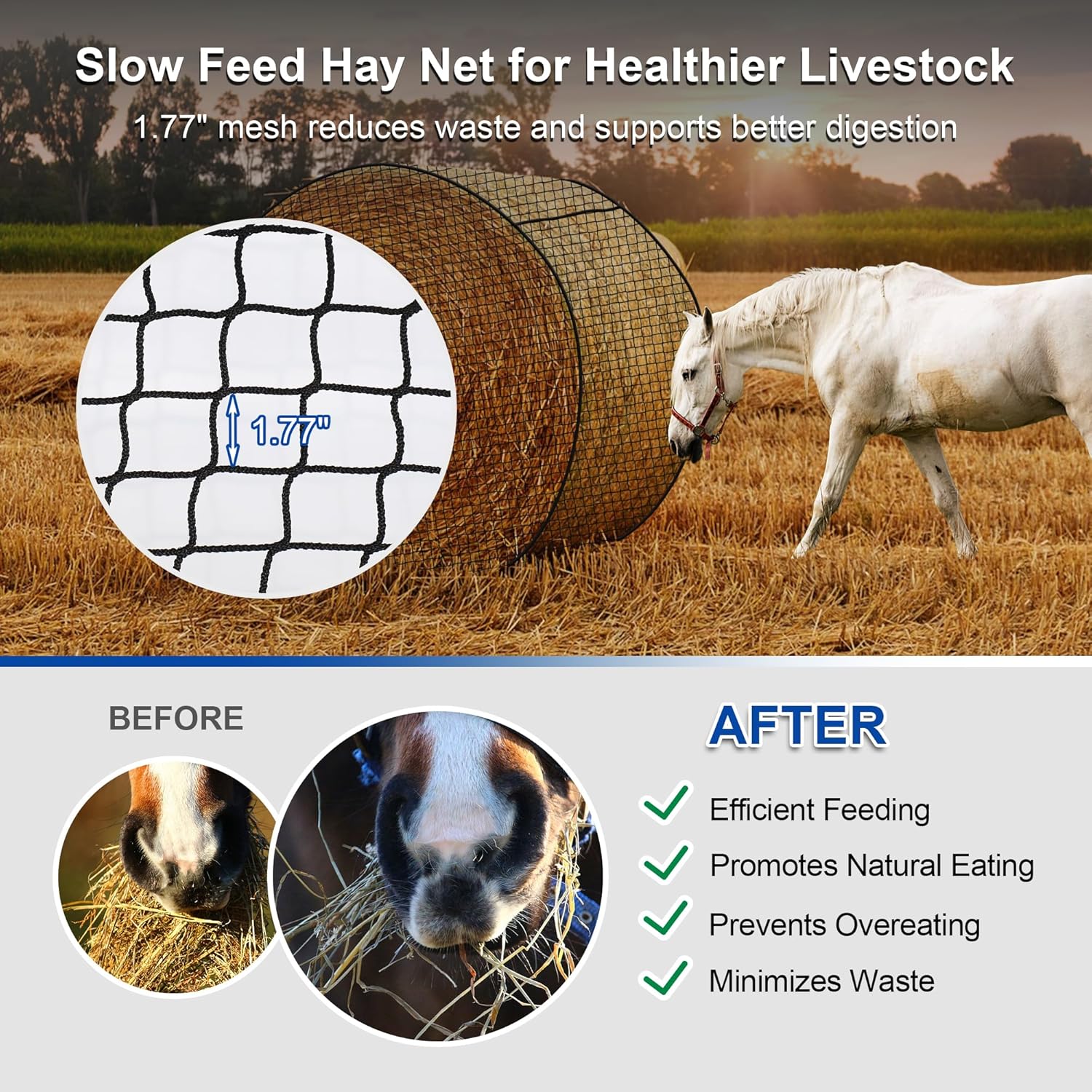【Reduce Waste and Save Costs】This expertly designed round bale hay net keeps hay securely gathered, preventing it from being scattered on the ground or damaged by being trampled into the soil. Its fine mesh structure ensures hay remains neat and clean, significantly reducing waste and prolonging its usable life. An essential tool for efficient farm and ranch management, this hay bag helps you save money, minimize waste, and simplify your daily tasks.