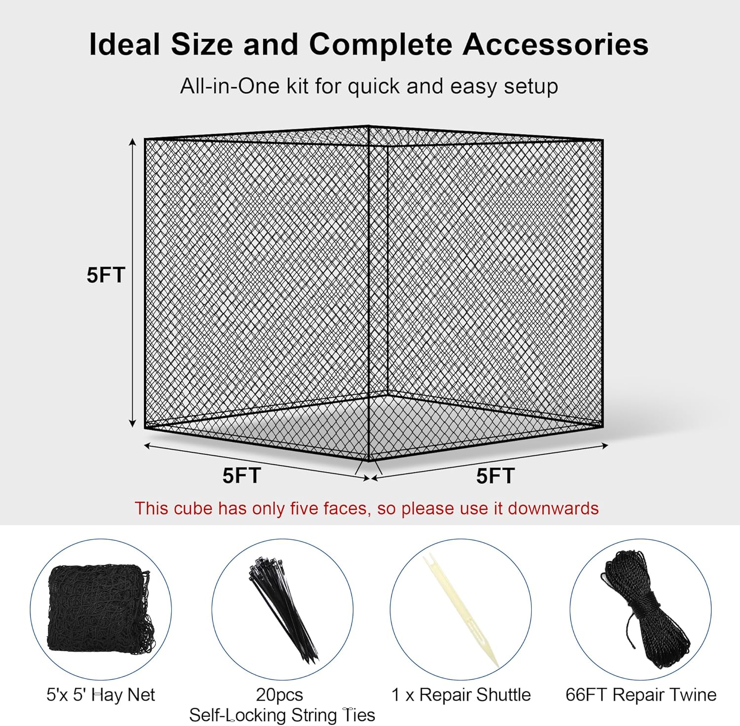 【Quick & Easy Hay Storage】This 5ft x 5ft hay net for horses features large openings for easy filling. Simply tighten the drawstrings to secure the bale—no special tools or skills required. The 20 self-locking ties offer added support for secure placement, and the included repair shuttle and 20m repair twine make maintenance effortless, extending the net’s lifespan. For optimal use, please ensure the largest surface area is in contact with the ground.