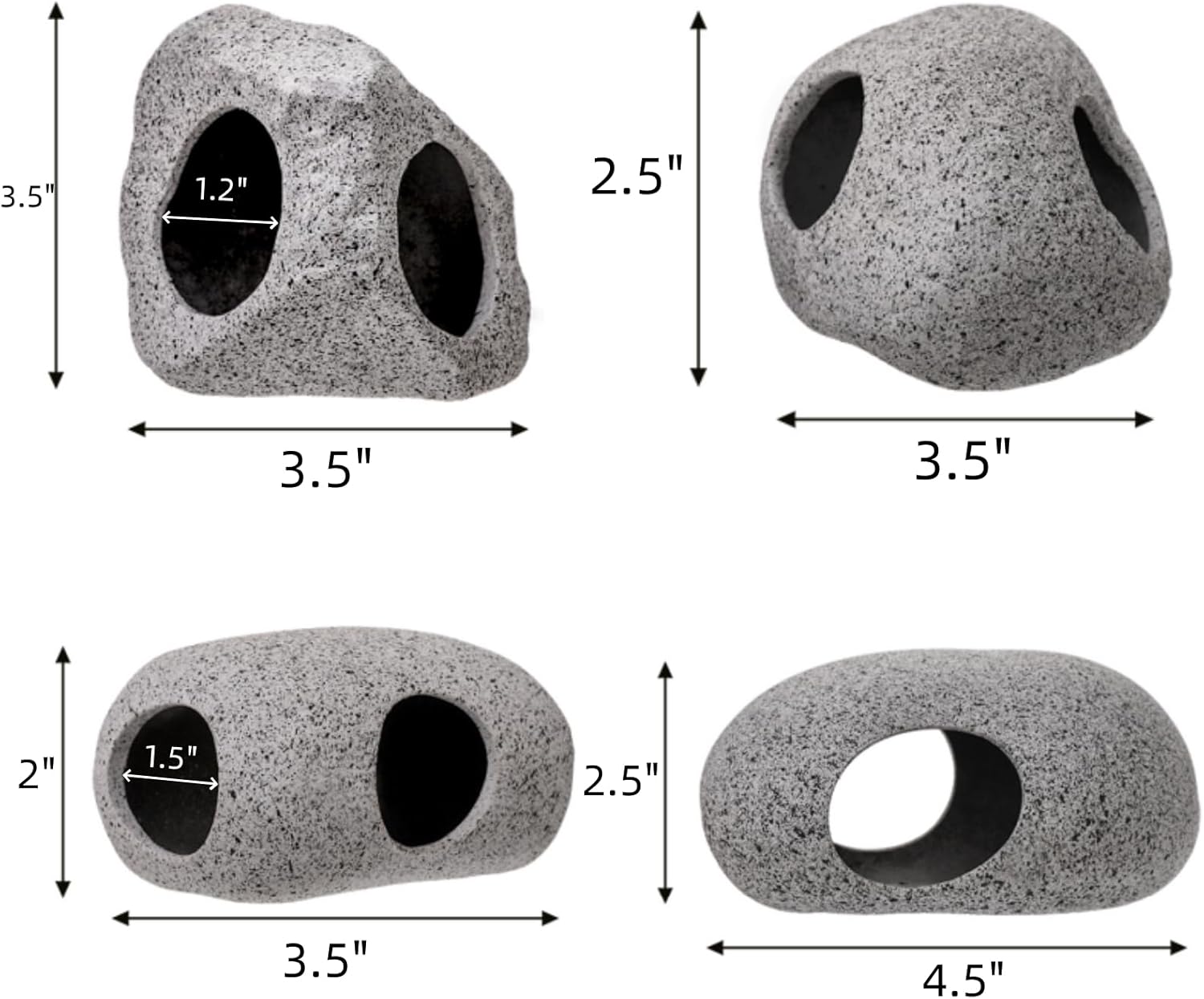 The fish tank hideout caves have 4 different sizes, 1 piece of 4.5x3x2.5 inch, 1 piece of 3.5×2.5×2.5 inch, 2 pieces of 3.5x 3.5×3 inch, 2 pieces of 3.5×2.5×2 inch, rich in size to meet the diverse needs of your aquarium landscaping.