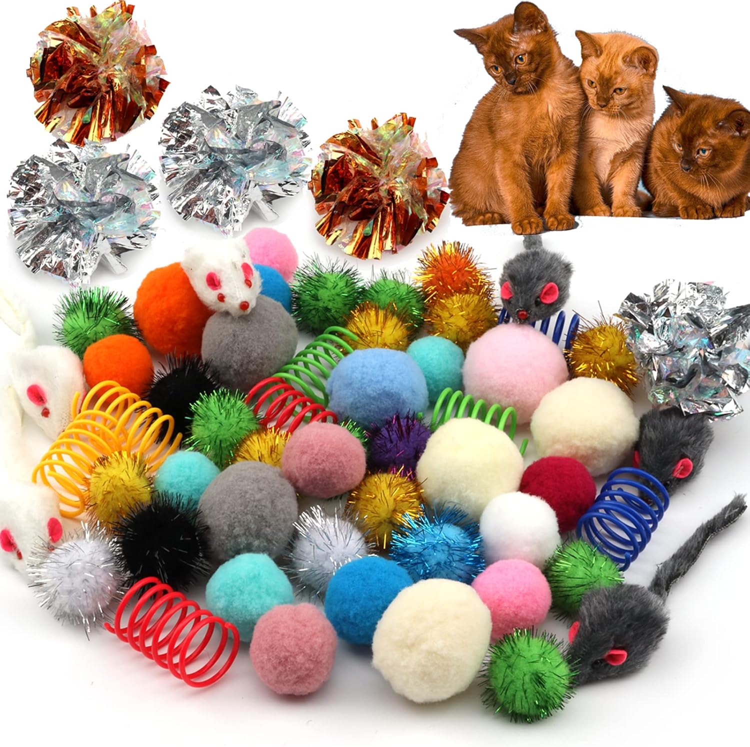 60 Pack Cat Toys – Assorted Kitten, Mouse, Crinkle & Pom Pom Balls