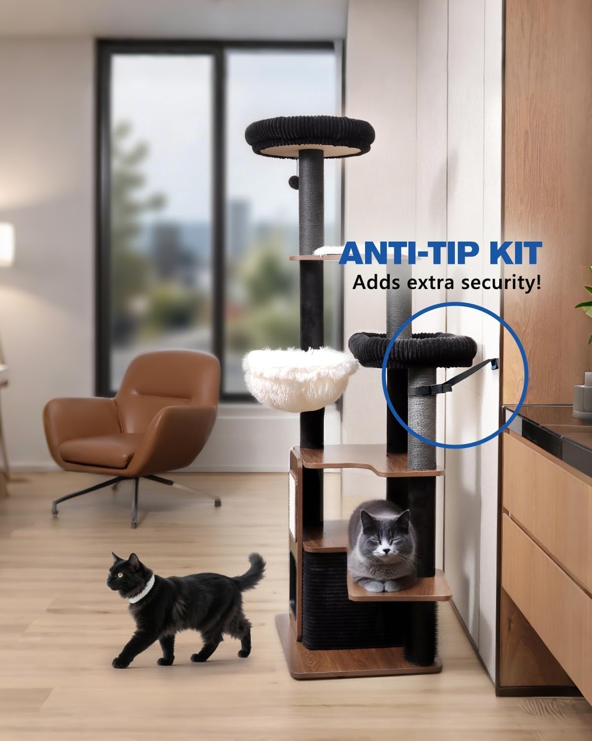 63″ Modern Cat Tree Tower for Indoor Cats, Heavy Duty Cat Trees for Large Cats, Adult Big Cats Maine Coon Cat Tree Tower with Scratching Post, Extra Large Top Perch, Cat Condos, Jet Black