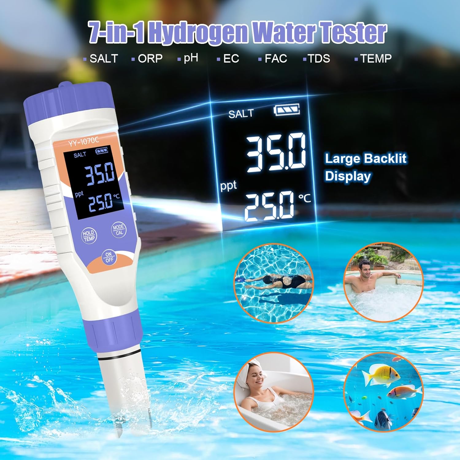 7-in-1 Digital Pool Water Tester – Chlorine, pH,Salt,ORP, EC, TDS&Temp Meter for Saltwater Pools, Hot Tubs, Spas, Aquariums&Hydroponics,Complete Digital Pool Chemical Tester for Safe&Healthy Swimming