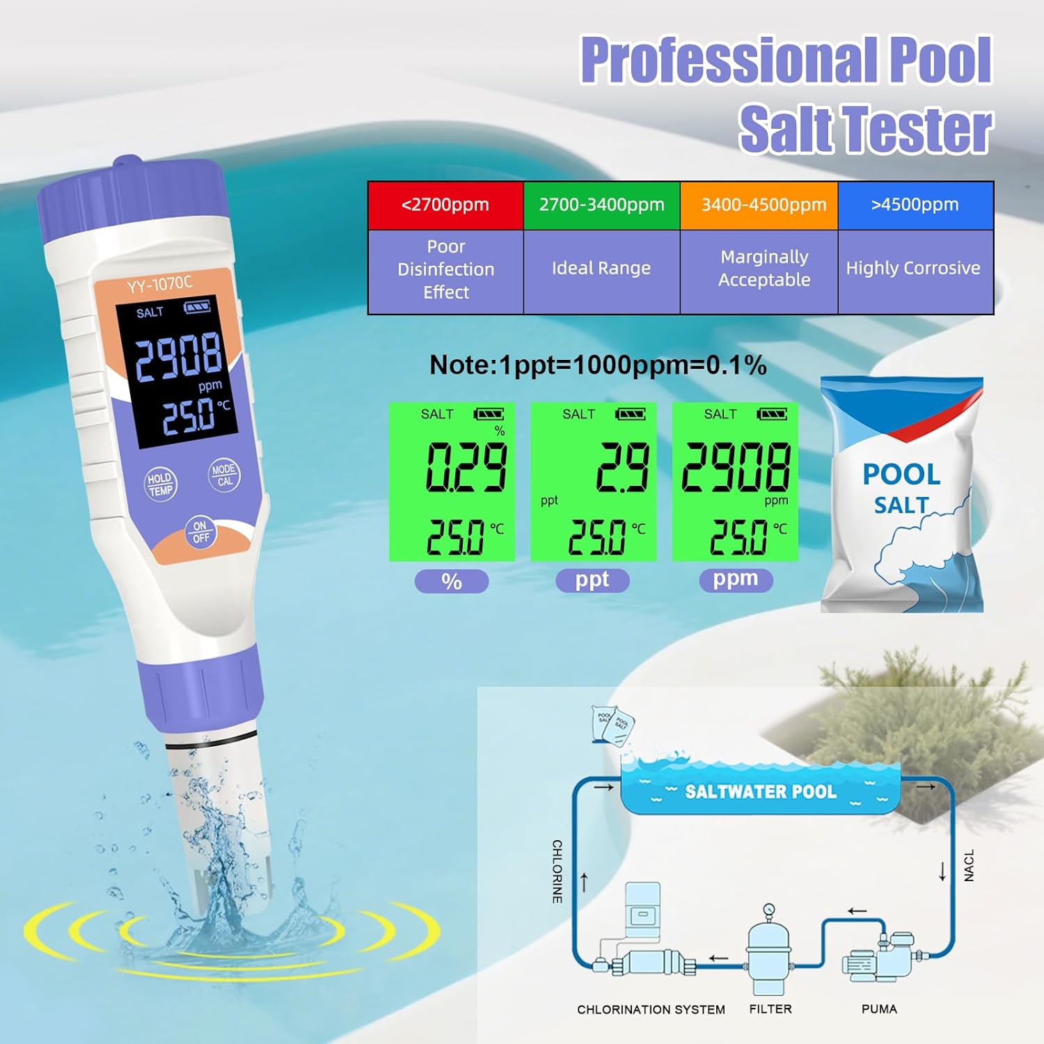 🧂 Professional Salinity Monitoring:Covers a wide detection range of 0.01%–25.00% / 0–10000 ppm, perfect for saltwater pools and hot tubs with chlorinator systems. Helps maintain optimal sodium chloride balance, improving water quality and extending equipment life.