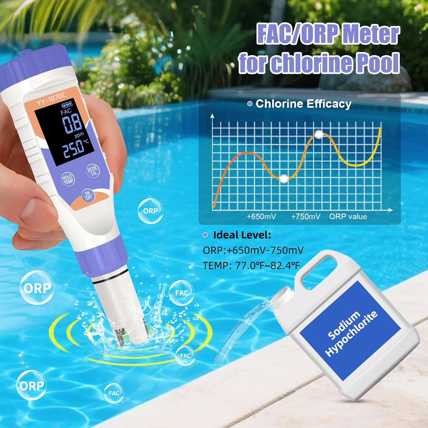🧪 7-in-1 Water Quality Checker:Combines pH (0.00–14.00), ORP, EC, TDS, FAC, salt, and temperature measurement in one easy-to-use digital meter. Say goodbye to inaccurate test strips—get consistent readings in seconds for your pool, spa, or aquarium.