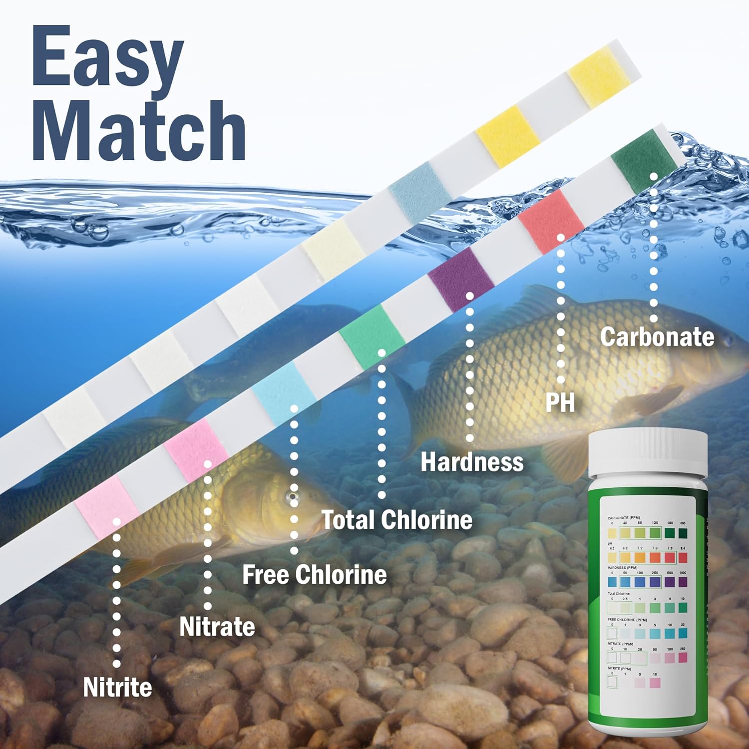 SUITABLE FOR ALL POND TYPES – Whether you manage a koi pond, backyard water feature, or freshwater aquarium, the test strips are tailored to meet your needs. The versatile 7-in-1 pond test strips ensure compatibility with various pond environments, these pond accessories help you safeguard water quality against harmful levels of chlorine, nitrite, and nitrate. Ensure your fish, plants, and ecosystem thrive with routine, dependable testing.