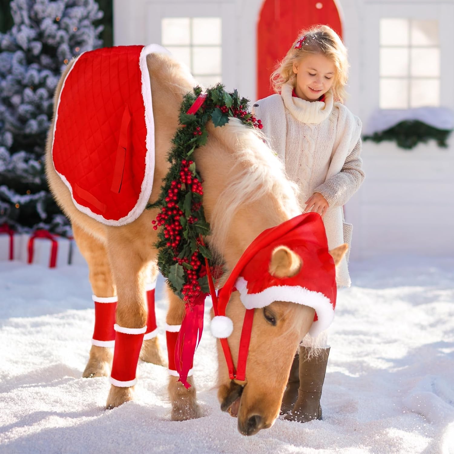 7 Pcs Horse Christmas Tack Christmas Horse Costume Accessories Holiday Christmas Hat Christmas Horse Leg Wraps Quick Dry Saddle Pad Adjustable Christmas Horse Halter for Party Parades Supplies