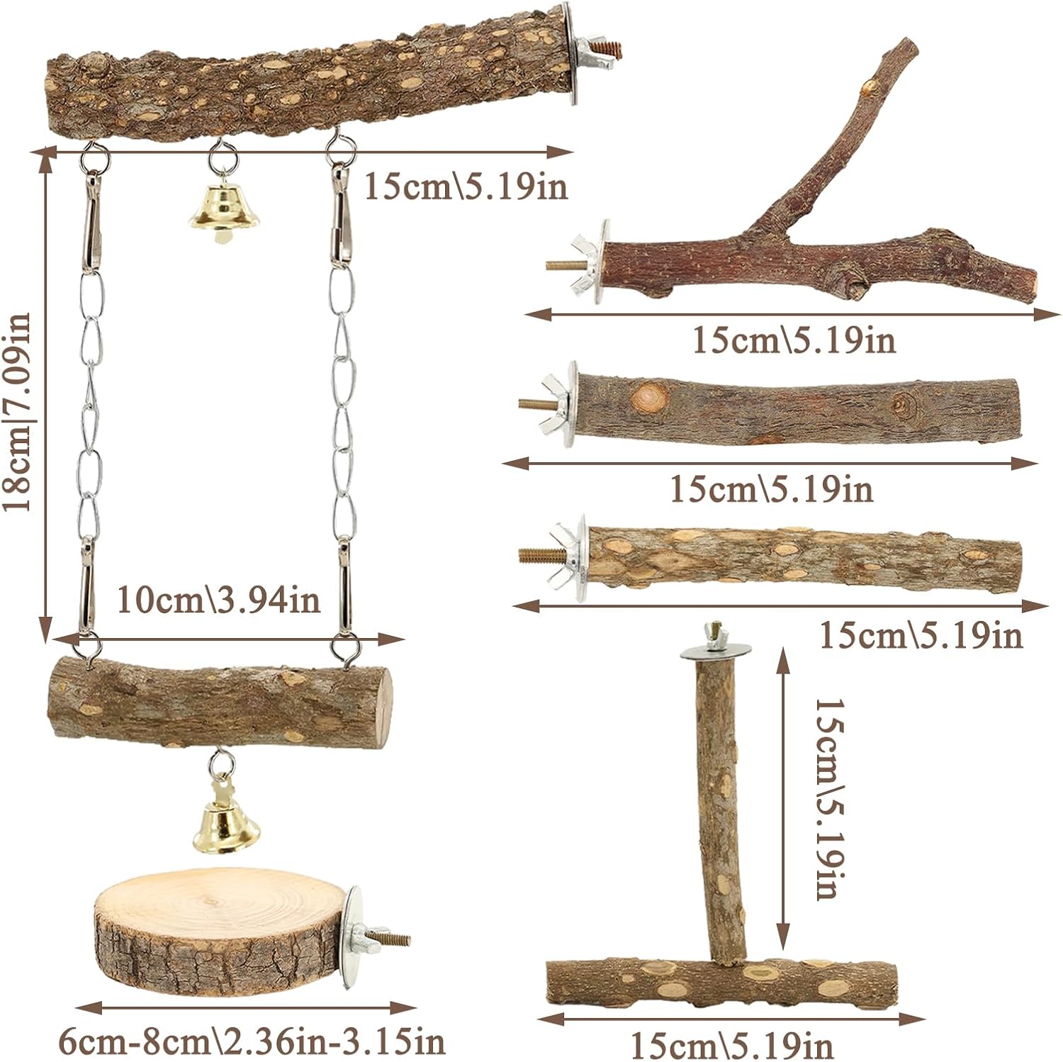 Multiple Styles: In order to meet the needs of different birds, our bird perch stand offers a variety of styles for you to choose from, including cloud ladder swing+y-shaped station pole+straight bar station pole+t-shaped sichuan pepper wood station frame+sichuan pepper wood station stick+parrot platform 2, each designed to bring more fun to your birds and make their lives more colorful.