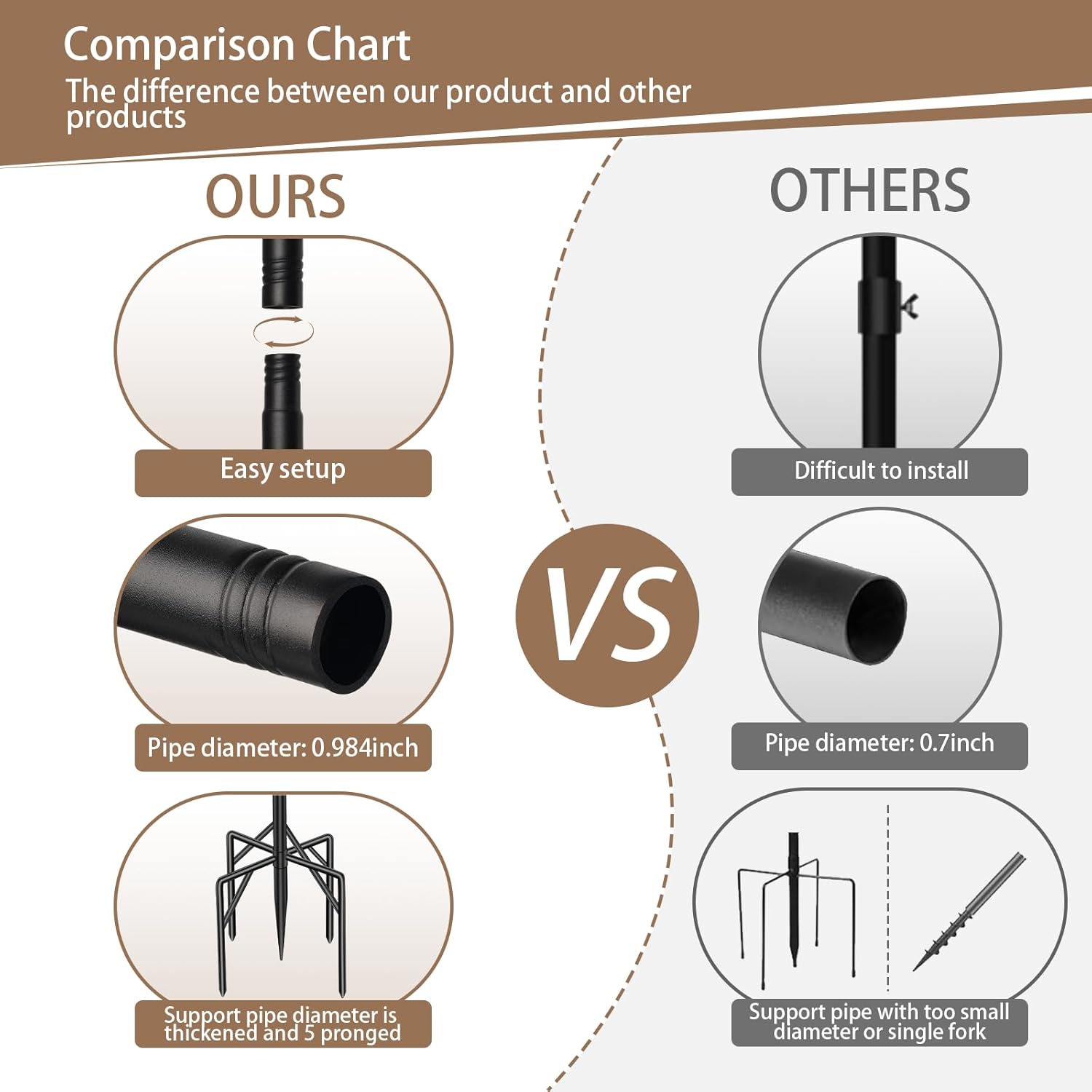 【Practical Design】The five-leg base is reinforced to ensure that the pole is more stable in the soil. The four legs are made of solid iron rods instead of hollow iron tubes, making it stronger and more durable than traditional bird feeder holder.