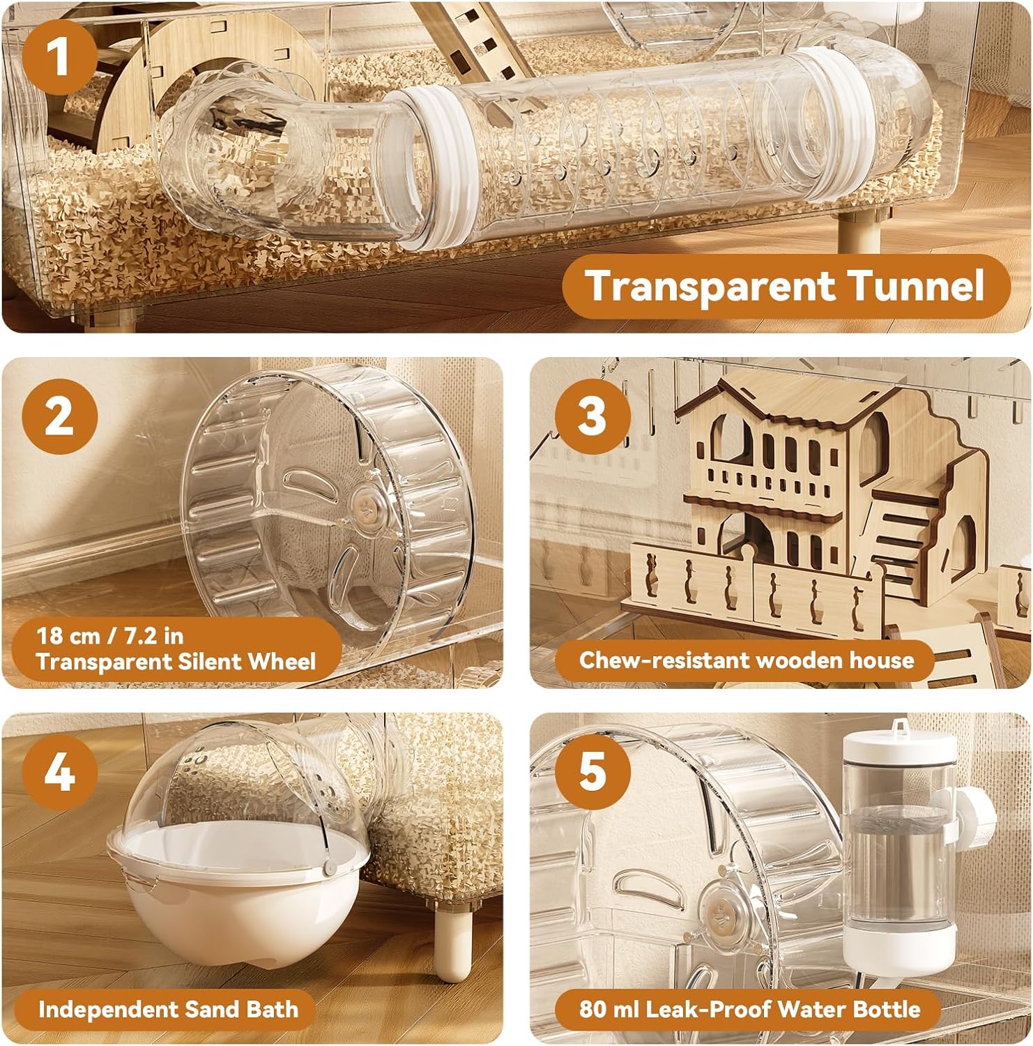 Clear 360° View – High-transparency acrylic hamster cage panels let you watch your dwarf hamster from every angle.