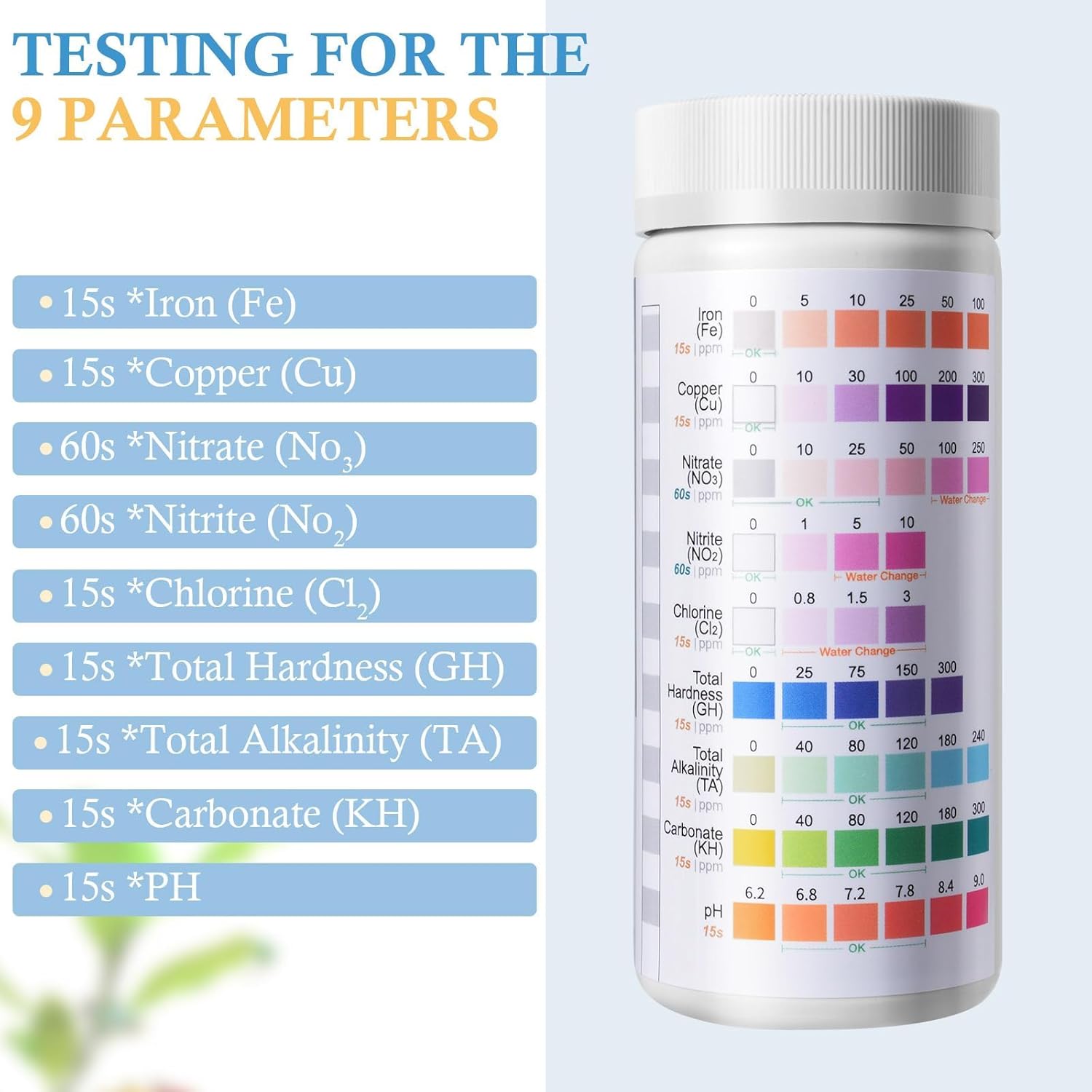 【9 in 1 Comprehensive Testing】:This aquarium test kit measures 9 key water parameters including Iron (Fe), Copper (Cu), Nitrate (NO3), Nitrite (NO2), Chlorine (Cl2), Total Hardness (GH), Total Alkalinity (TA), Carbonate (KH), pH, helping you maintain a healthy and balanced fish tank environment with confidence