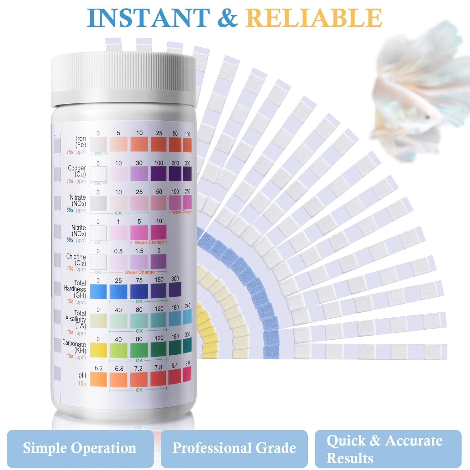 This set of 120 test strips is a must-have for any aquarium owner. It measures 9 crucial water elements, including pH, carbonate, alkalinity, total hardness, chlorine, copper, iron, nitrates, and nitrites. Itâs perfect for maintaining a healthy tank, though it’s important to note that it doesnât test for ammonia which you should be testing for separately if you have an aquarium.Packaging: The packaging for these strips is very thoughtful. The container is compact and convenient, and the instructions along with the color scale are printed directly on the bottle, allowing me to discard the box without losing important information. The strips feature a long section for easy handling, and the color scale aligns well with the test indicators, making it straightforward to read the results.Usage: Using the strips is simple; just dip them completely into your water sample for 2-3 seconds and read the results within 15 seconds for all but the nitrate/nitrite which you read in 60 seconds. The instructions are printed next to the scale making it easy to remember which ones to read first. This is such an important detail since the most important factor for incorrect measurements is not following the instructions!Reading: The color scales for these test strips are honestly one of my favorite aspects. They feature vibrant colors that are easy to read in different lighting conditions. One of the most frustrating aspects of some other test strips is when it is difficult to differentiate between colors on the scale. The scales on this test strip all run a wide range of color hues or intensities, making it easy to identify which value it is measuring.Accuracy: I tested these strips against my API kit which measures pH, nitrates, and nitrites and found the results to be fairly consistent. I also tested my water before and after adding a water conditioner, and it did pick up on the change in chlorine. Overall, itâs a reliable and user-friendly kit for maintaining your aquarium.