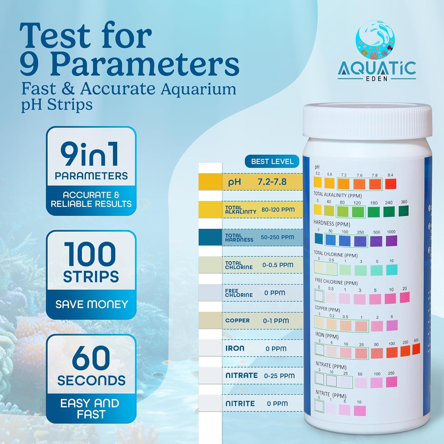 9-IN-1 AQUARIUM TEST STRIPS: Test 9 critical water parameters in one simple step, including Iron, Copper, Nitrate, Nitrite, Chlorine, pH, Total Hardness, Carbonate Hardness, and Total Alkalinity. Perfect for both freshwater and saltwater aquariums, it provides a complete understanding of your water quality.