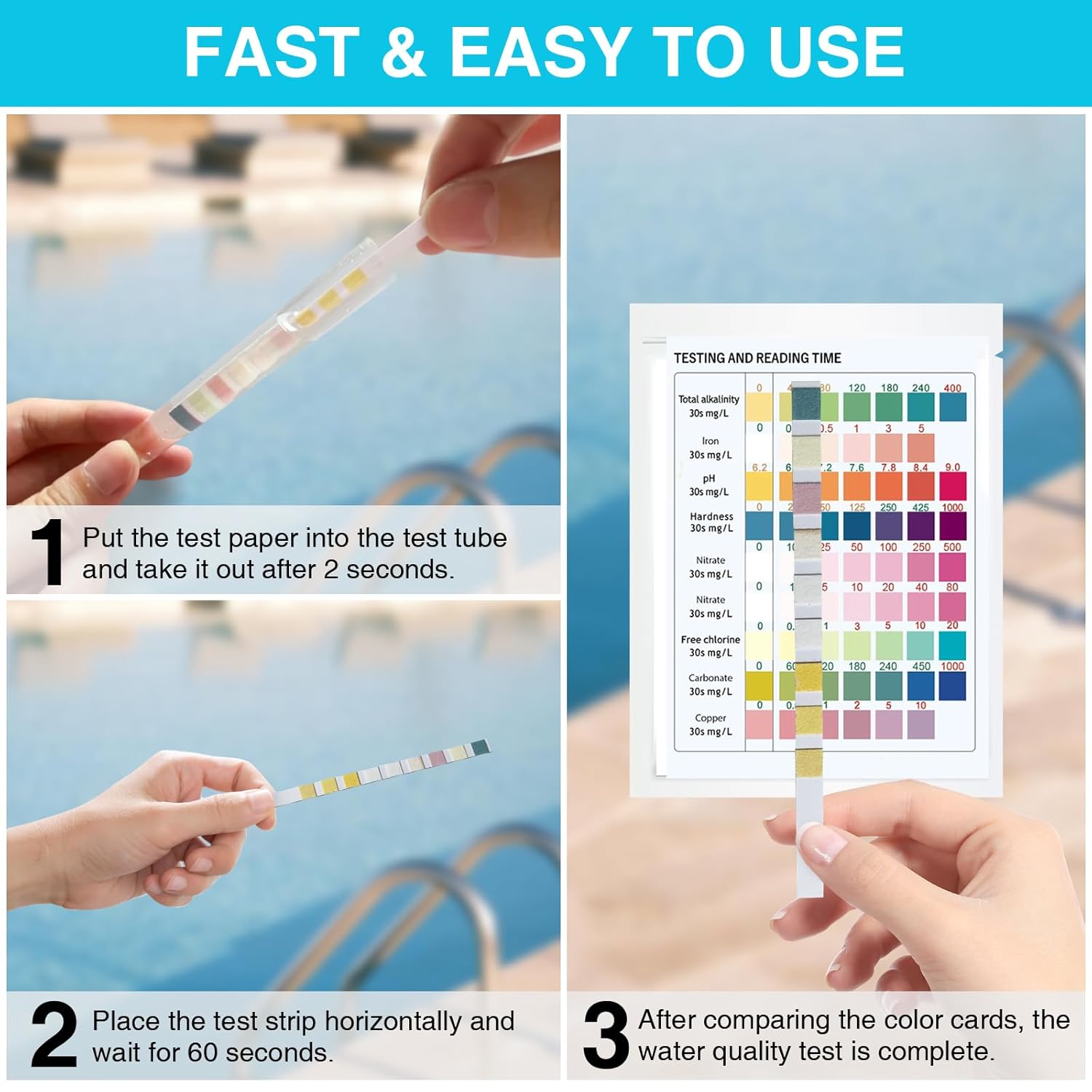 Testing water at home or for a pool used to be guesswork. Now I dip a small strip, wait a moment, and compare results to a chart. It flags potential issues swiftly, so I can correct them before anyone experiences problems. The set includes many strips, good for multiple checks. The process is quick, giving consistent feedback. No more complicated or expensive tests needed.