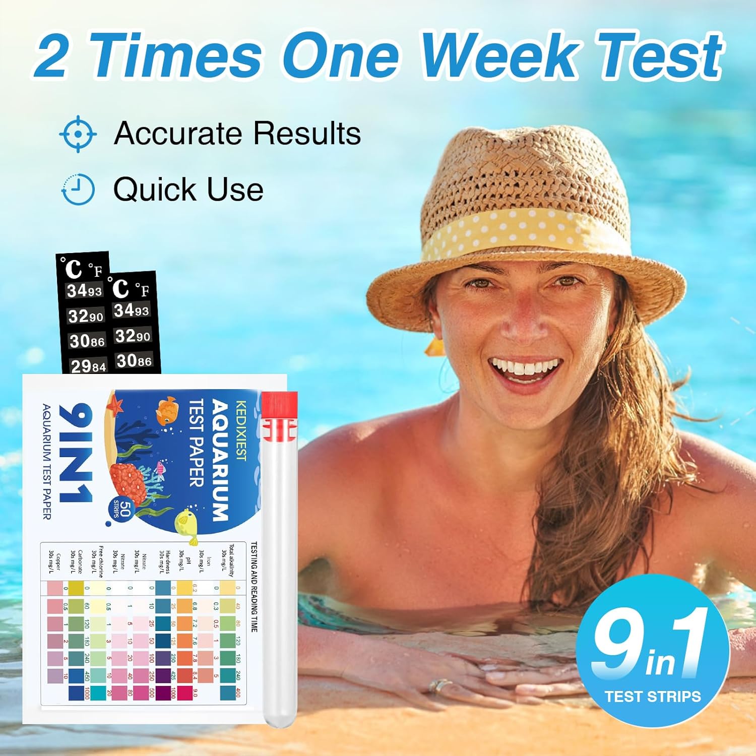 9-in-1 Pool Test Strips Kit (50 Strips) – Accurate Water Test for pH, Chlorine, Bromine, Hardness, Salt, Copper & More – Includes 2 Thermometer Tubes – for Pools, Hot Tubs & Aquariums