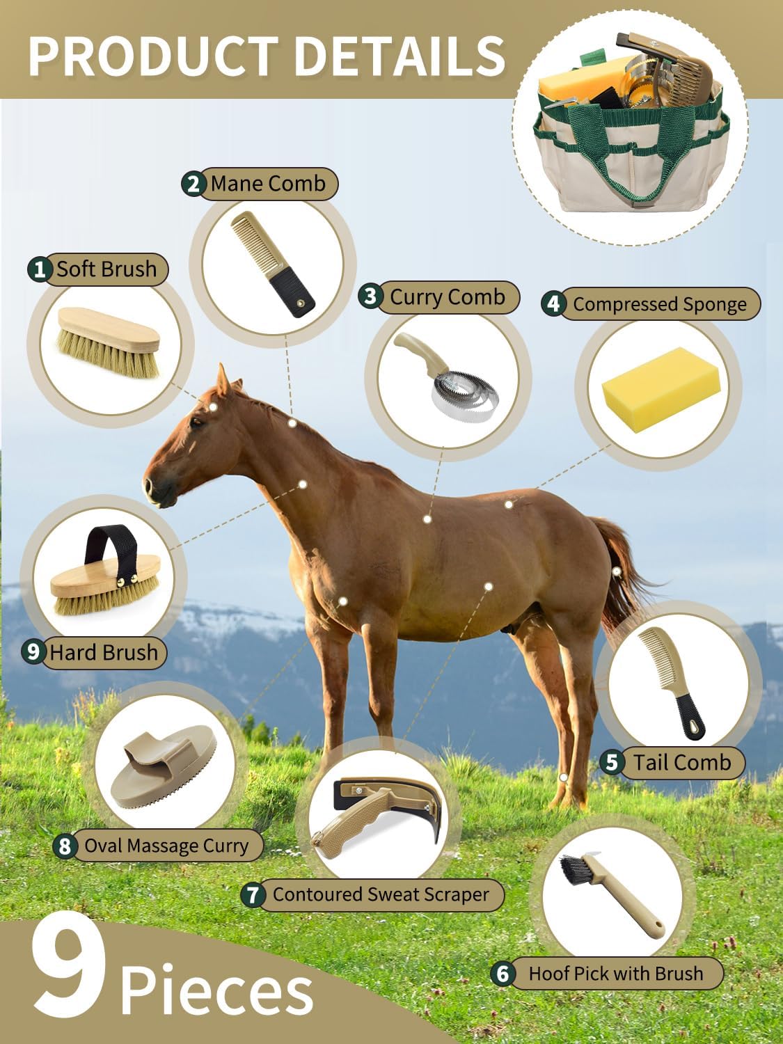 9 Pieces Horse Grooming Kit with Organizer Tote Bag, Horse Brushes for Grooming and Bathing, Professional Equine Coat Care Tack Room Supplies Set, Gift for Horse Lover