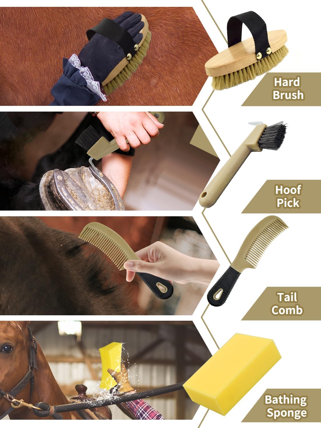 All-in-One Set of Essential Grooming Tools: This kit includes everything you need for full-body grooming: Soft Brush, Hard Brush, Bathing Sponge, Oval Massage Curry, Mane Comb, Tail Comb, Hoof Pick with Brush, Sweat Scraper, and a Reversible Stainless Steel Curry Comb. Every tool is designed to meet the unique grooming needs from mane to tail and hoof