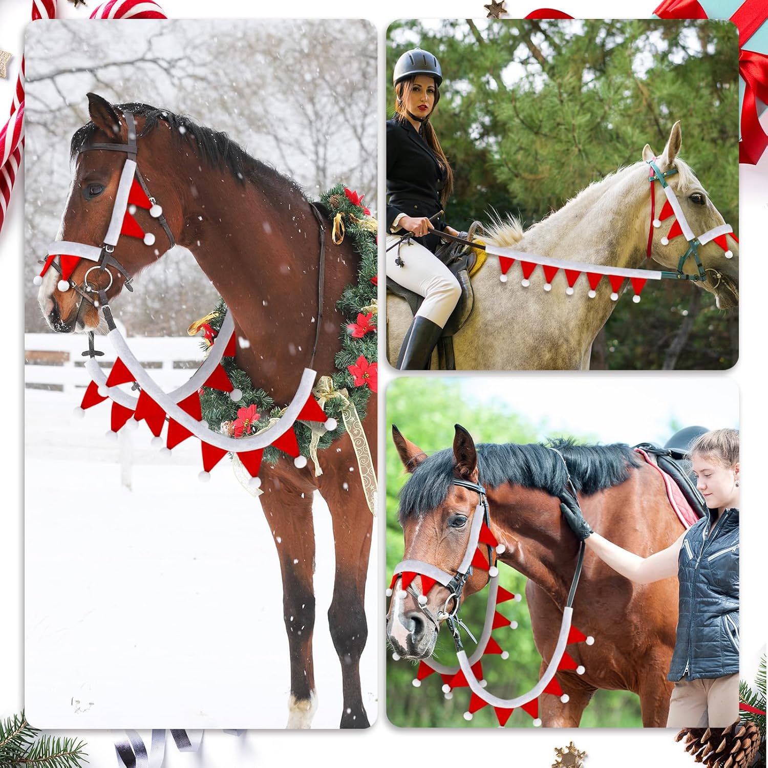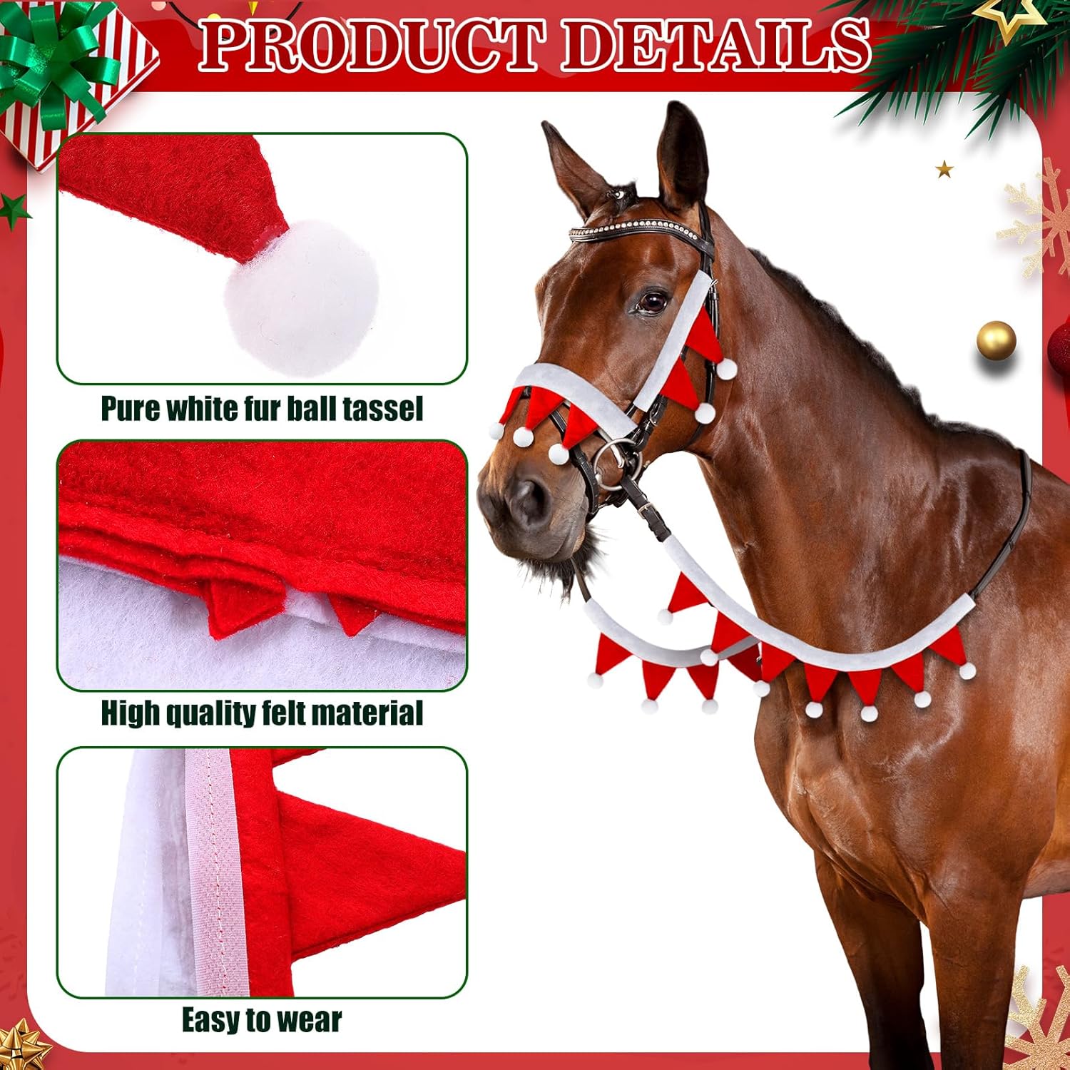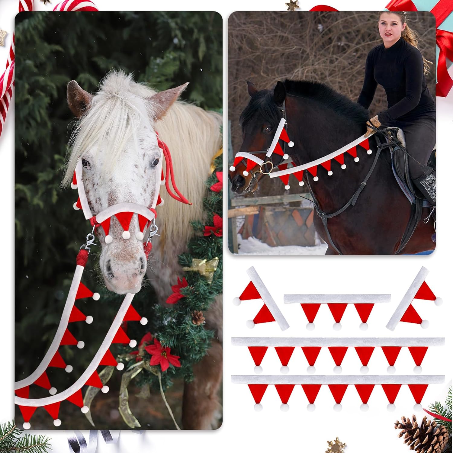 Unique Design: this mini santa bridle set adopts the Christmas theme color red and white combination, creating a strong Christmas atmosphere; Equipped with exquisite white wool balls, Increases decorative effect, eye-catching, suitable for holiday events and photo taking
