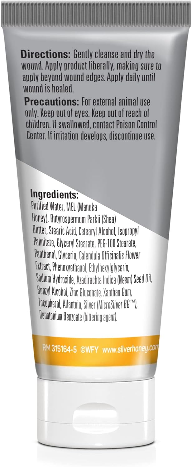 I bought this silver honey wound ointment for our cat when he was attacked by another cat and the wound was infected. We did take him to the vet, got him shots and all of that, but the wound was still leaking and needed help to heal from the inside out. Our vet had said they would give us a prescription antibiotic, but I had heard amazing things about silver and the Absorbine name is something I trust, so I wanted to try this. I was not disappointed. Our cat’s wound healed quickly and well using this ointment. It was easy to apply, stayed on the wound, and healed him up quickly. I am so happy with the results of this product, I tell all of my friends about it.*Update*Several months after my original review, my dog chewed her paw to the point that she took off a layer from one of her pads. In the past, we have taken her to the vet and gotten her an antibiotic ointment. I wanted to try Silver Honey first this time. I am SO glad that we did! Within days, the wound was healing nicely, with the aid of keeping a sock on her paw so she wouldn’t lick at it and the wound would stay clean. In less than a week, her paw looks much better and we are so happy with this product! It has healed both our cat and our dog nicely, saving us hundreds of dollars that would have been otherwise wasted at the vet.Disclosure: I am NOT a vet and I am not saying that if your pet is hurt you should not take it to the vet. This product worked VERY well for us, and I CANNOT guarantee those results for everyone.