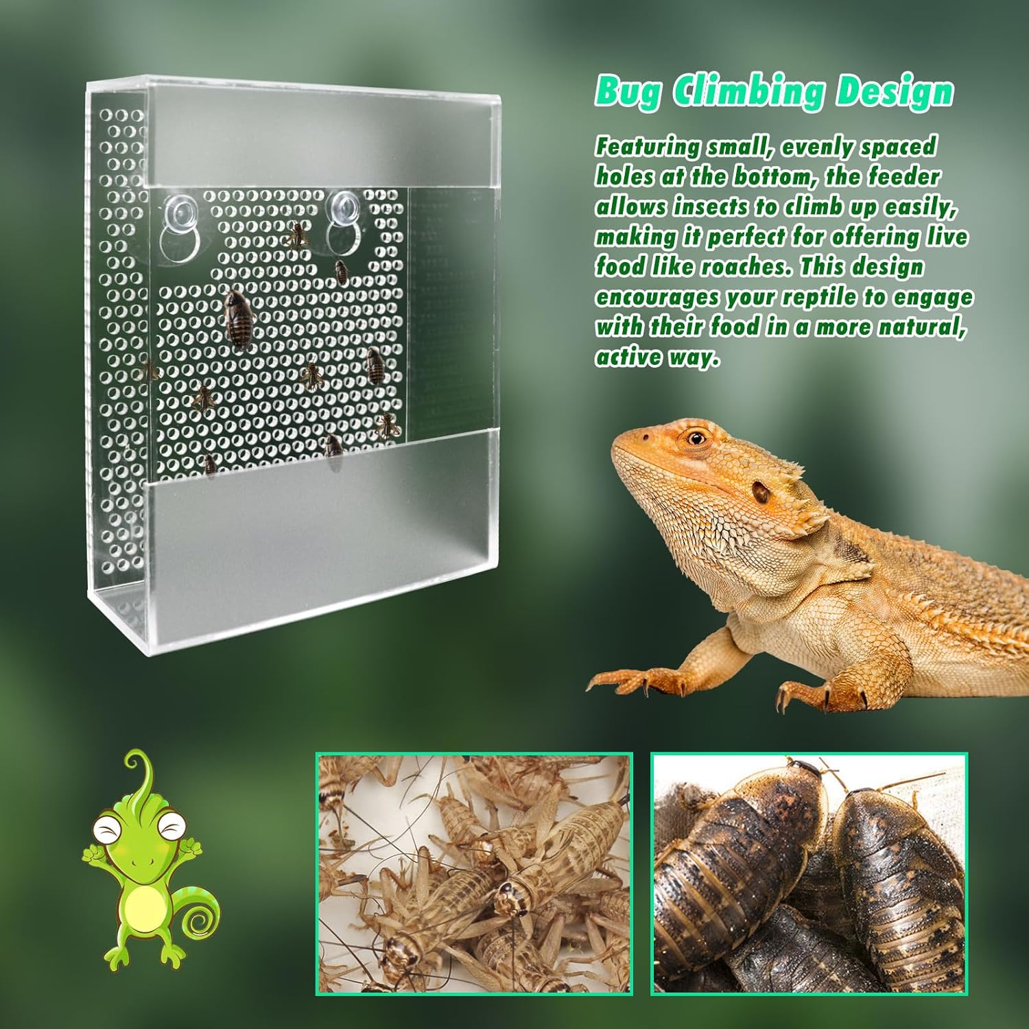 【Bug Climbing Design】: Featuring small, evenly spaced holes at the bottom, the feeder allows insects to climb up easily, making it perfect for offering live food like roaches. This design encourages your reptile to engage with their food in a more natural, active way.