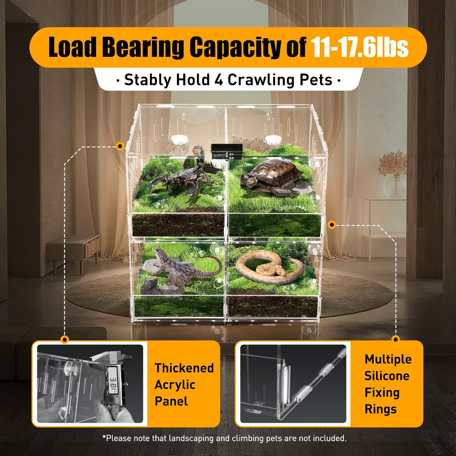 【Extreme Stability】 Thickened acrylic panels (3.8mm) and multiple silicone fixing rings ensure that acrylic enclosure has a load bearing capacity of 11-17.6lbs and holds up to 4 climbing pets without collapsing easily