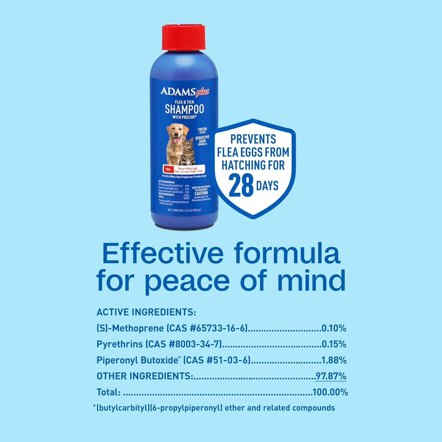 ADAMS Plus Flea & Tick Shampoo with Precor IGR for Cats, Kittens, Dogs & Puppies Over 12 Weeks Of Age, Sensitive Skin Flea Treatment, Kills Adult Fleas, Flea Eggs, Ticks, and Lice, 6 Ounces