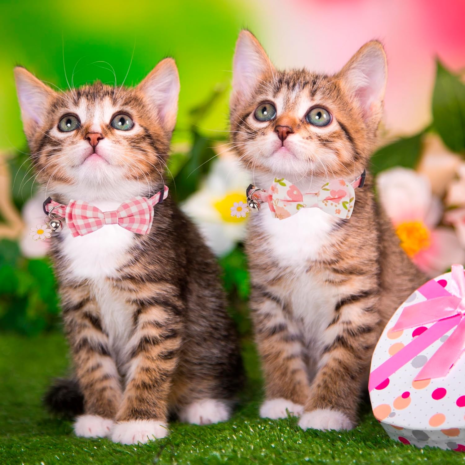 ADOGGYGO Pink Cat Collar with Removable Bow Tie Bell, 2 Pack Pink Plaid Cat Kitten Floral Bowtie Collar (7.5″- 10.5″)