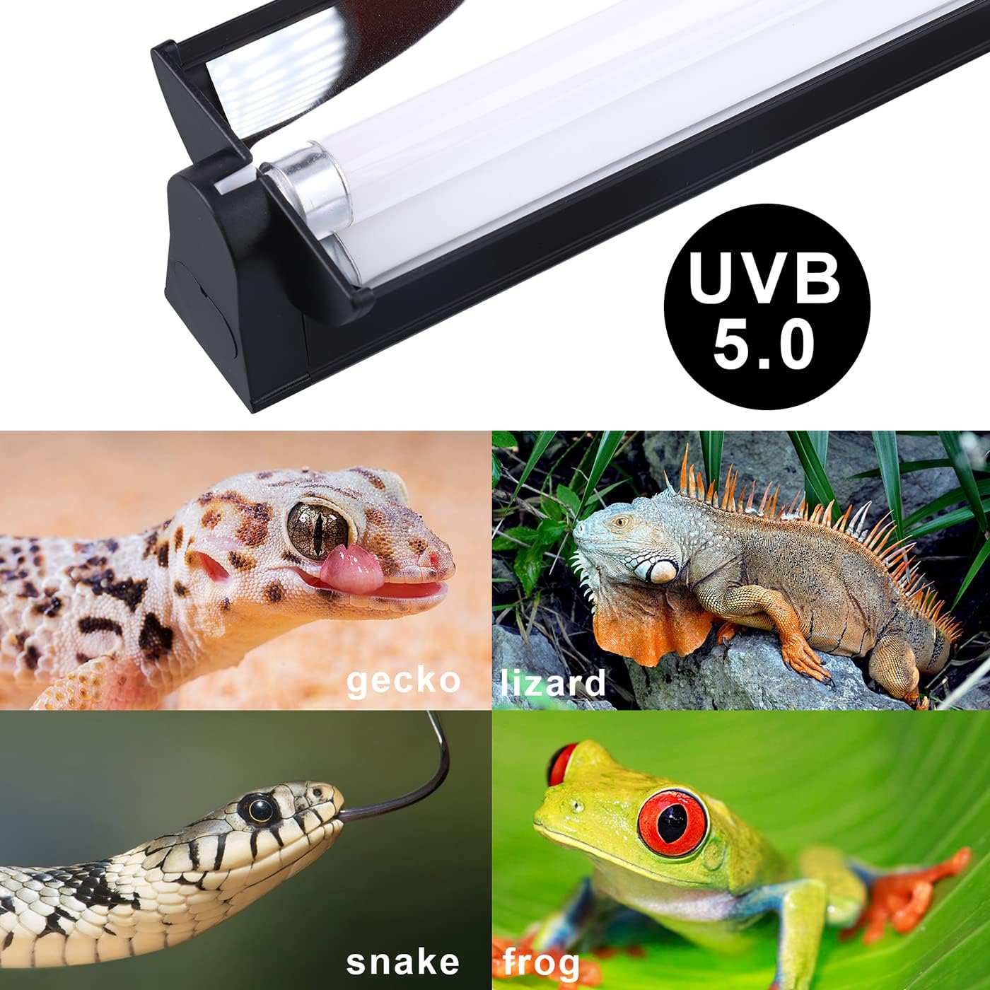 T5 UVB Reptile Light Package Contains – Reptile tank accessories uva uvb reptile light fixture is equipped with 8W T5 5.0 UVB lamp, T5 terrarium kit light fixture 12 inch, 5ft power cord of lamp accessories and heat lamp accessories for hanging. Please keep and read t5 uvb reptile light fixture instructions before installation uvb reptile light and using uva uvb reptile light bulb.