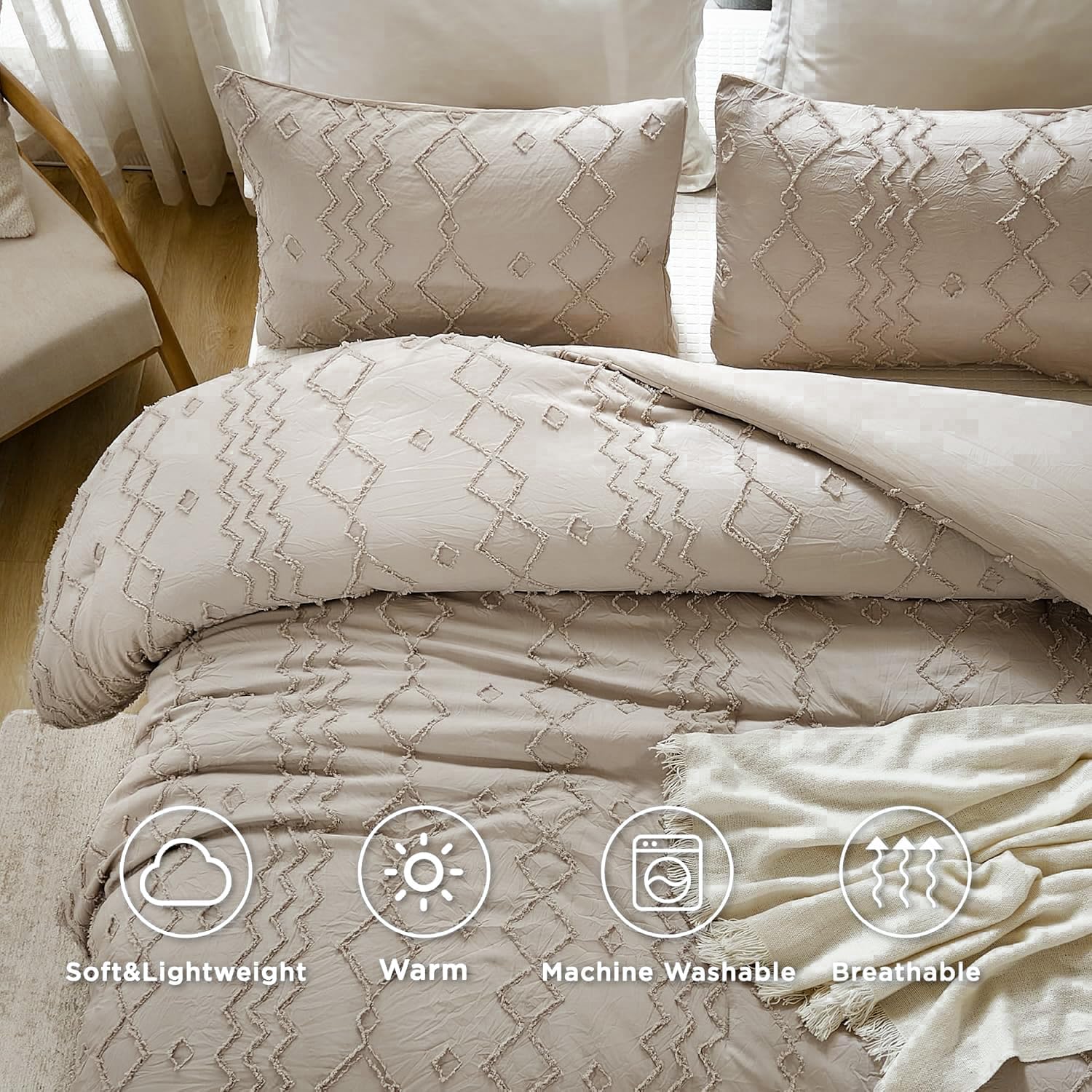 【Tufted Design】: Andency boho comforter set with a classic tufted design, solid color with delicate geometric patterns, backed with flat soild sheeting, minimalist and stylish. Classy tufted embroidery pattern brings a unique and luxurious look to any bedroom, simple yet sophisticated design to refresh your bedroom
