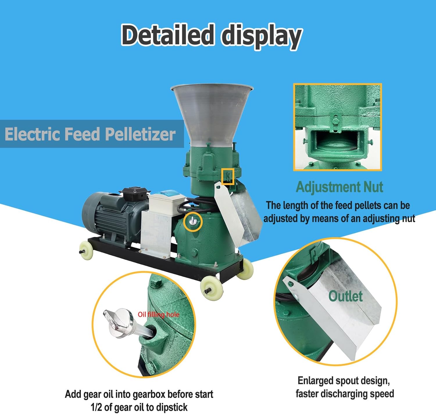 Unique Design: Designed with enlarged feeding opening, which makes the feeding process more convenient and efficient. Equipped with 3 adjustable nuts for adjusting the distance between the roller and the grinding disc. The outlet is equipped with an adjuster, which can be adjusted to control the length of the feed