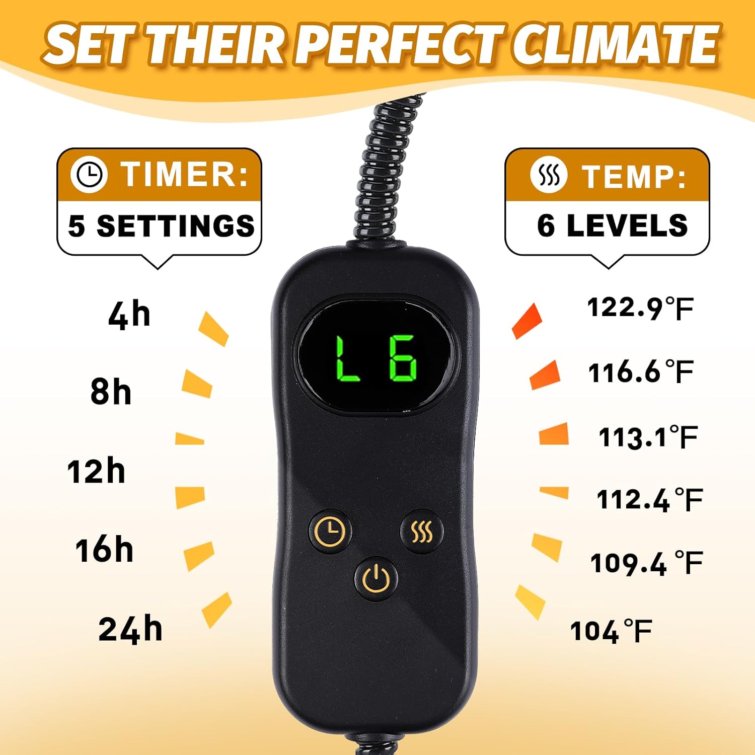 Safety First with Adjustable Temperature: The animal heating pad comes with a temperature controller and overload protection for your peace of mind. The heating pad offers 6 temperature levels and 5 timer settings, allowing you to easily adjust both temperature and timing to suit your needs. If the internal temperature reaches 55°C, it automatically shuts off to prevent overheating and potential fire hazards