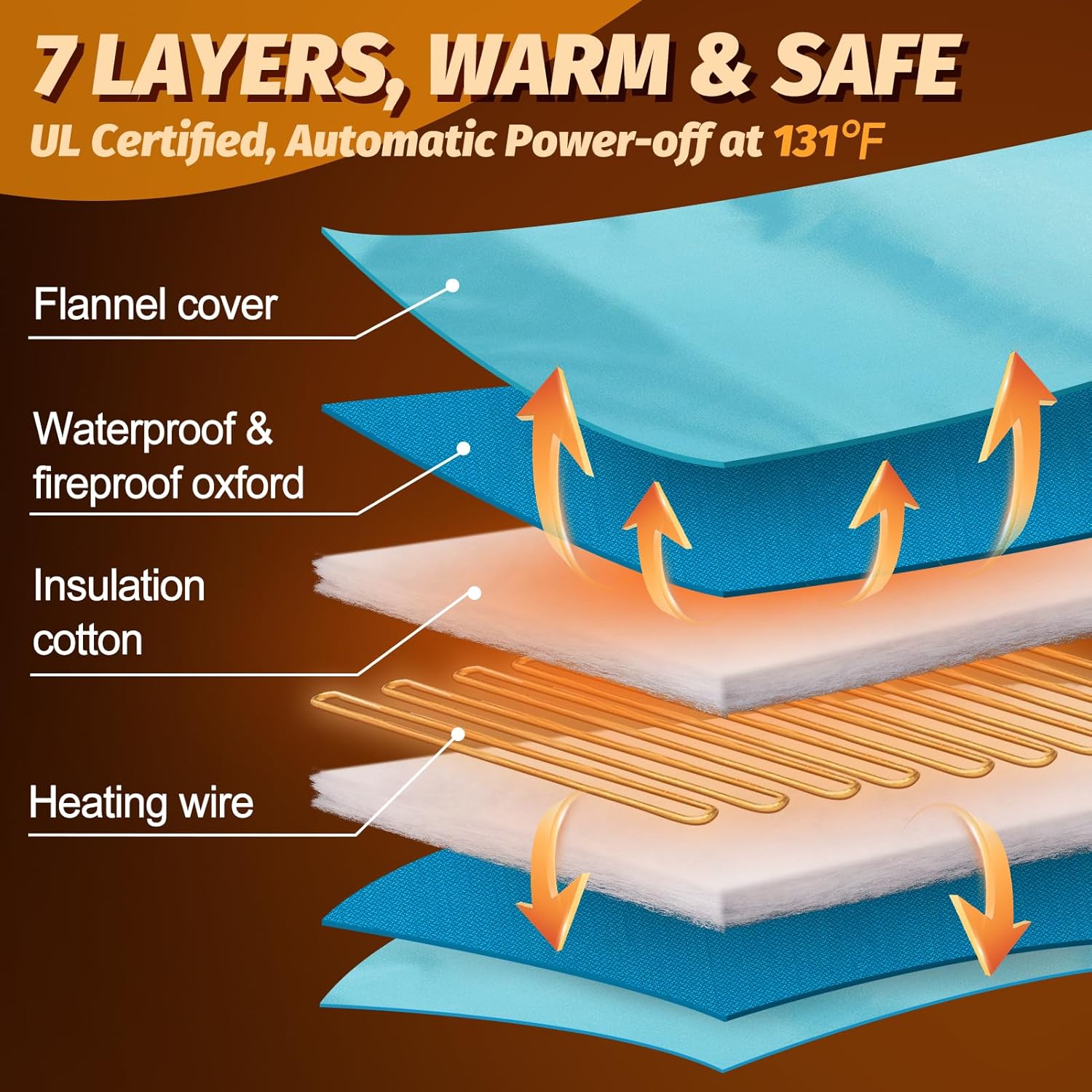 High-quality Materials: Our heating pad is constructed with multiple layers of material. The heating wire is wrapped with 2 layers of insulation cotton and two layers of specially designed waterproof and flame-retardant Oxford cloth. This ensures the pad won’t short-circuit due to rain or pet urine