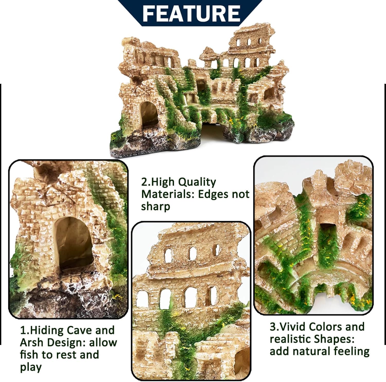 Compatible size: the aquarium castle decoration is about 11.1 in(L) x 5.9 in(W) x 7.8 in(H); it comes with small passage, fish can making fun around them; the aquarium decor provides several caves, allow fish to play and rest blithely in and around it