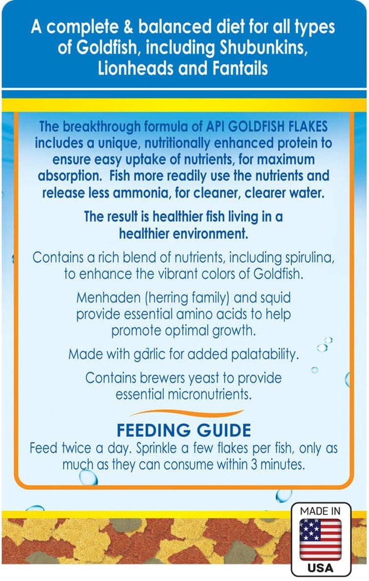ð I was incredibly pleased with the price of the API GOLDFISH FLAKES Fish Food that I bought while they were running a great deal! ð«§This 36-Ounce size container is a perfect for my needs on monthy feedings and it offers my fish nutritional richness that surpasses any counterparts on the market when it comes to flake quality!ðThe blend of protein, fiber and essential amino acids promotes healthy digestion and growth. Causing less waste and ammonia production, which in turn, ensures a cleaner and clearer water environment making this food choice great to add to my fish diet. It really gives overall a better functionality in many other aspects as well!ð«§The added yeast, garlic, vitamins C and E supply and support the immune system. It boosts the vibrant colors of my goldfish, and I see the results! Definitely a great choice to give your fish so that they get a complete and balanced diet!ðThis is truly a good food choice for many kinds of breeds and life stages of fish. Five stars for healthier fish in my koi pond – and happier me!âï¸âï¸âï¸âï¸âï¸