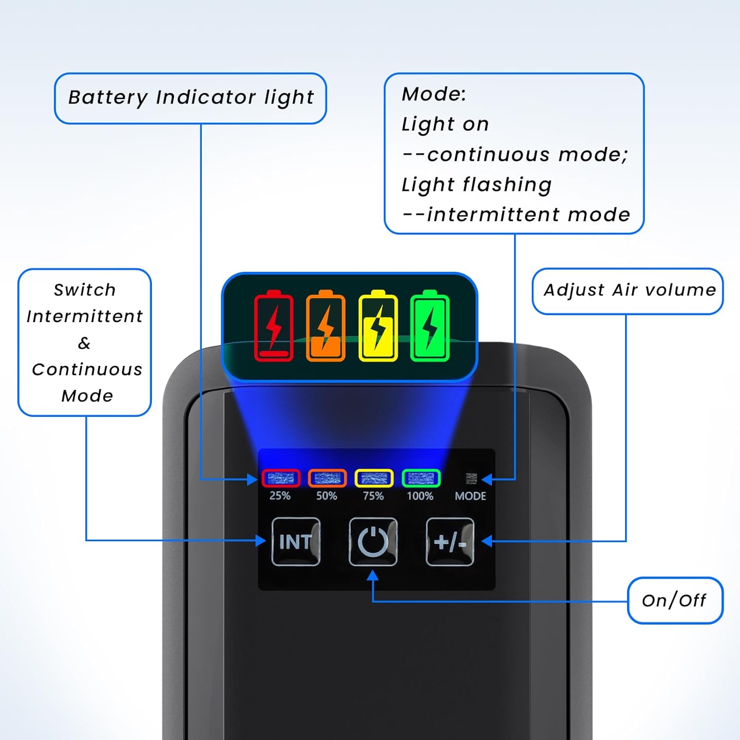 Continuous & Intermittent modes: The aquarium pump has two modes of operation: continuous mode: continuously supplying oxygen to the aquarium; intermittent mode: supplying oxygen for 10 seconds and pausing for 10 seconds