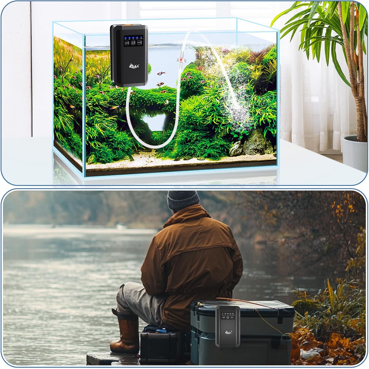 Compact & Portable: AQQA aquarium air pump features light weight, portable and space saving, with a hanging hook, it can be hang to any fish tank or bait bucket in seconds. With a full charge you can take it for outdoor fishing.