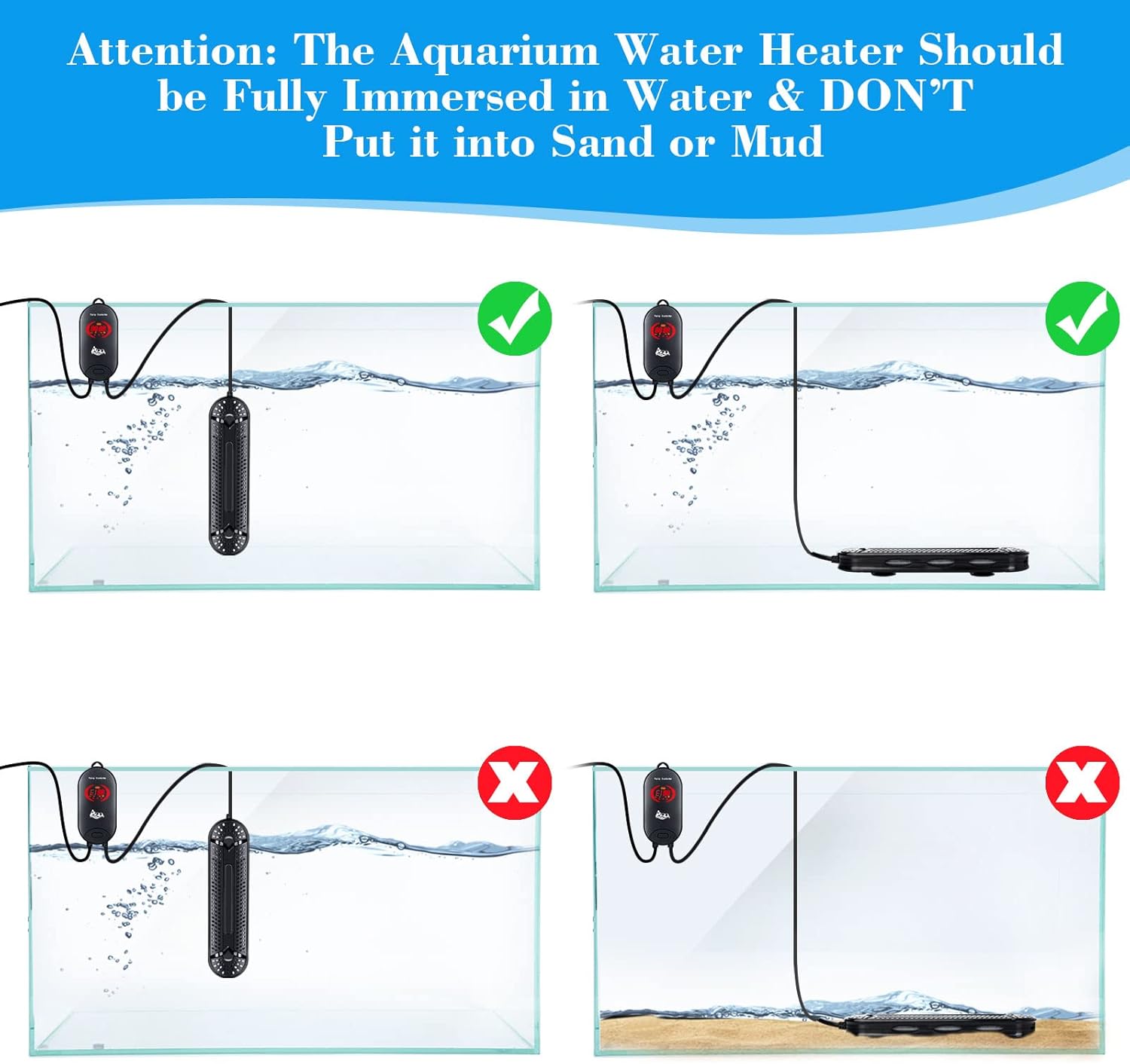 Warm Notification: Please note that the aquarium heater must be fully submerged in the water but don’t bury it into sand or mud. Please put the heater near the water flowing area to prevent uneven heating and unplug the power supply when cleaning the fish tank or aquarium water changes