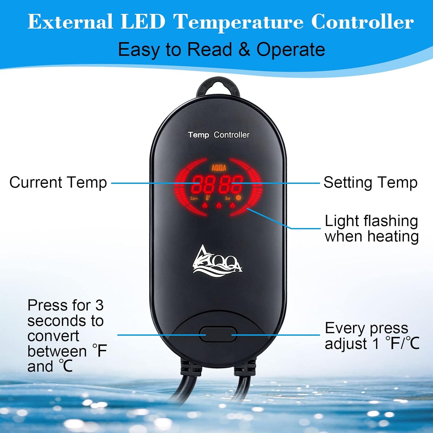 Easy Installation and Temp Setting: You can install it at any angle by 2 powerful suction cups, just make sure it is under water fully. You can set temp with an external temp controller, press the button for 3 seconds to switch beween ℉ and ℃,and every press to adjust 1 ℉ /℃. Easily adjust the temp without hands getting wet. (Note: the controller is not waterproof)